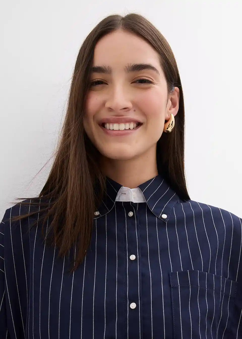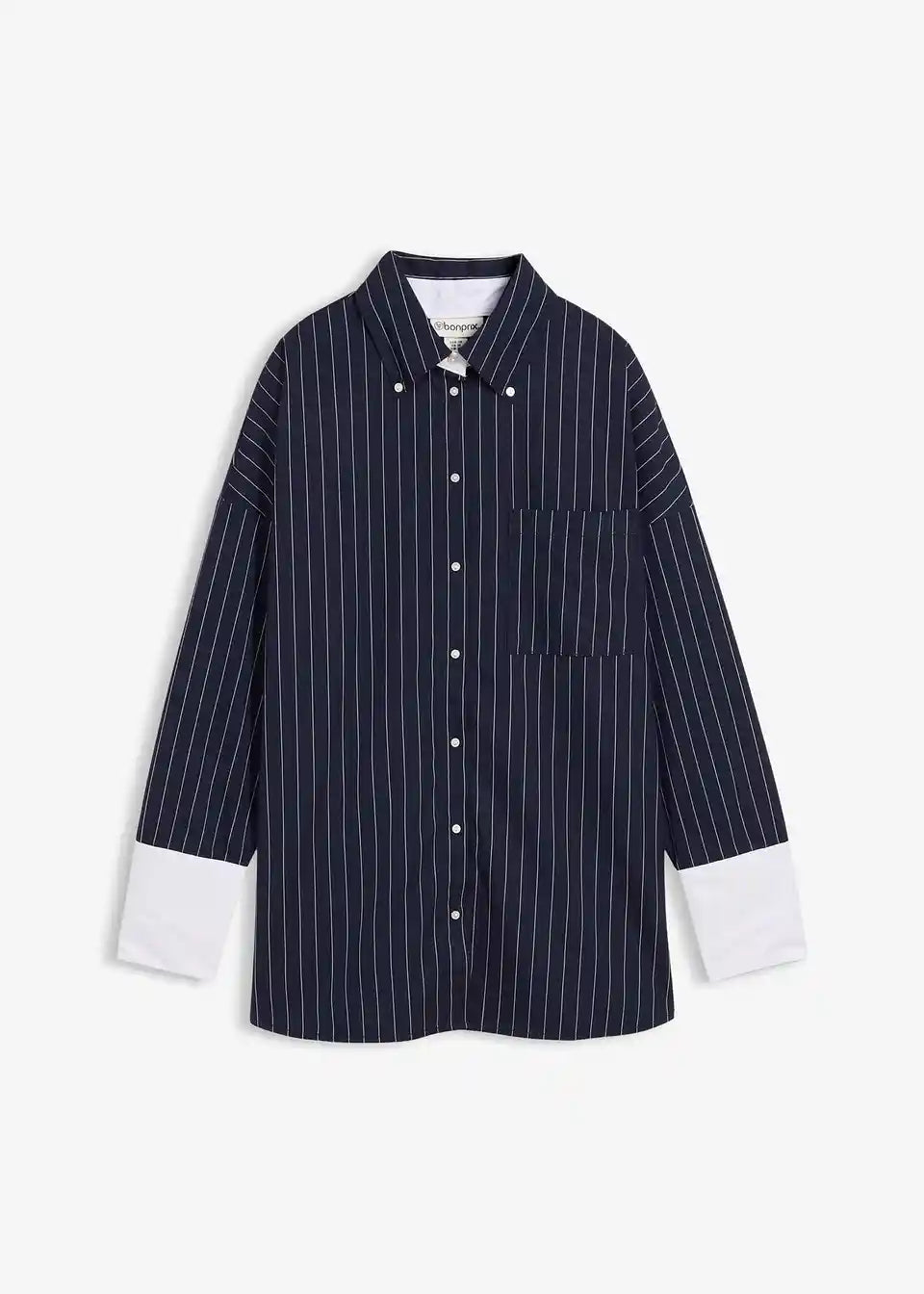 Oversized Bluse mit Kragen, Knöpfen vorne und einer offenen Brusttasche. Lange Ärmel mit geknöpften kontrastfarbenden Manschetten.