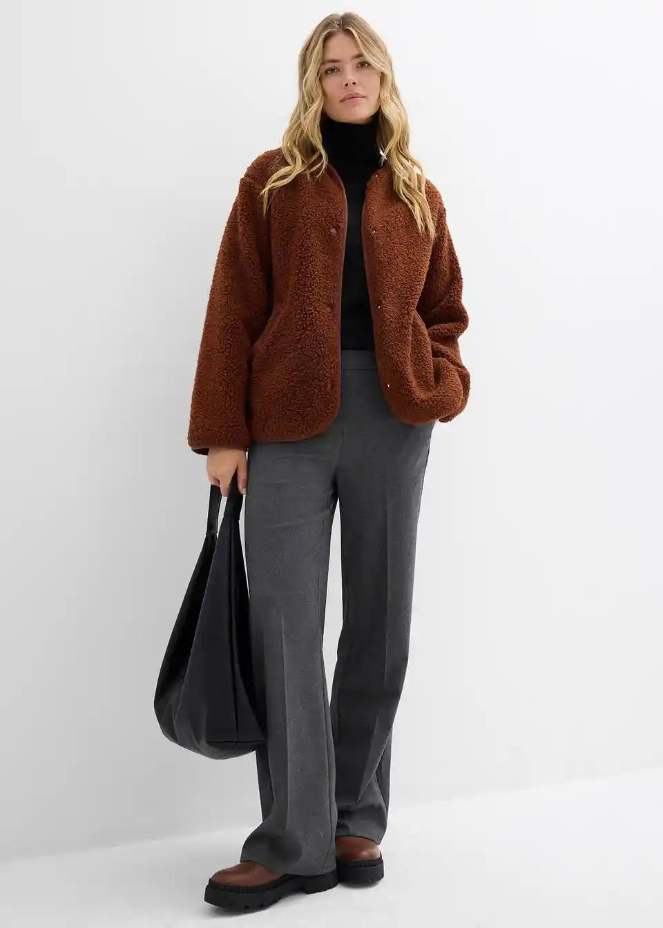 Teddy-Fleece-Jacke in hüftbedeckender Länge mit leicht abgerundetem Saum und seitlichen Eingriffstaschen.