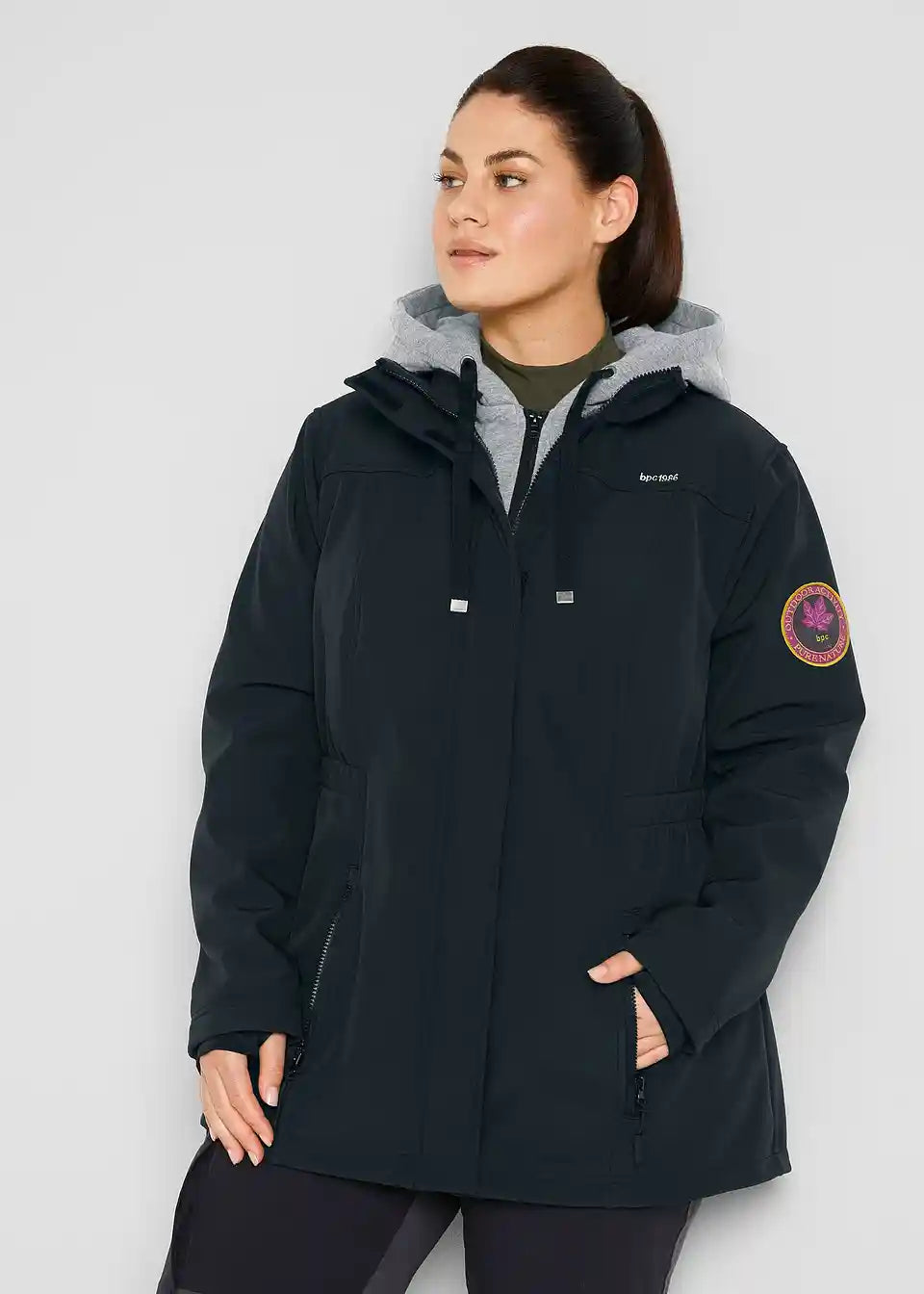 Alle Frauen, die gerne draußen unterwegs sind, werden diese Softshell-Langjacke in 2-in-1-Optik schnell zu schätzen wissen. Die funktionale Softshell-Jacke ist mit einem Sweateinsatz gefüttert und wird mit einem 2-Wege-Reißverschluss geschlossen. Das weiche Sweatmaterial und ein zusätzlicher elastischer Einsatz auf Taillenhöhe sorgen für ein sehr gutes Tragegefühl. Die Softshelljacke ist winddicht, wasserabweisend sowie atmungsaktiv und von innen intensiv gerauht.Praktische Details wie die Daumenlöcher und zwei vordere Reißverschlusstaschen machen die Jacke von bpc zu einem unerlässlichen Kleidungsstück im Alltag.