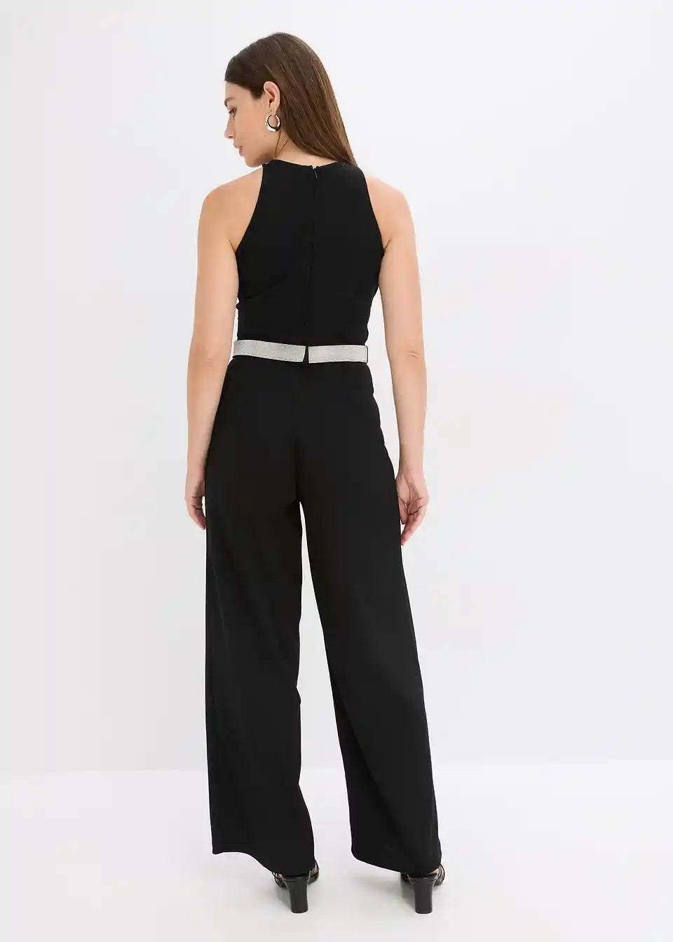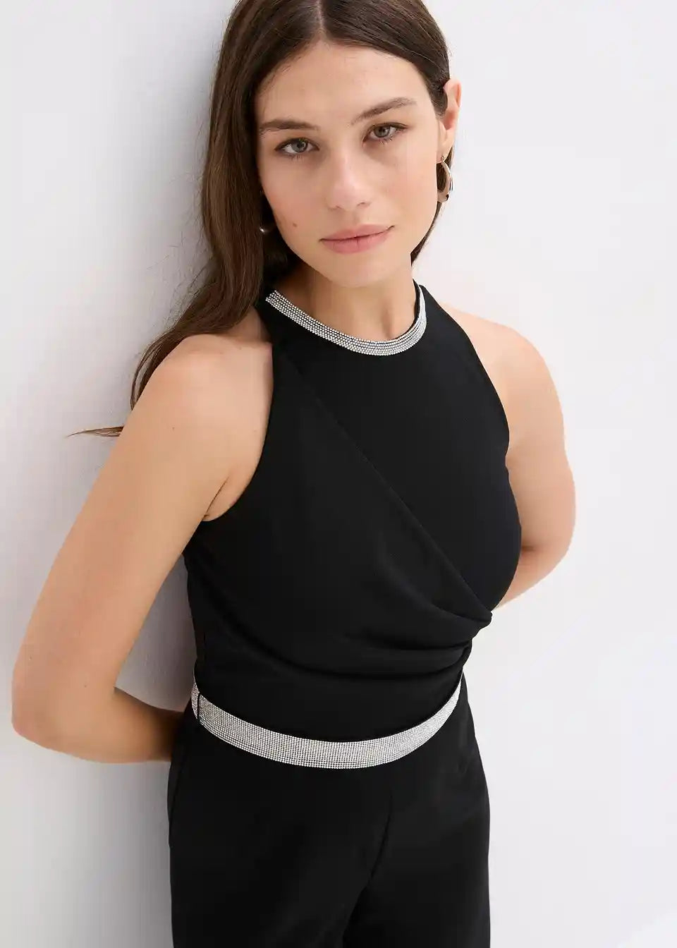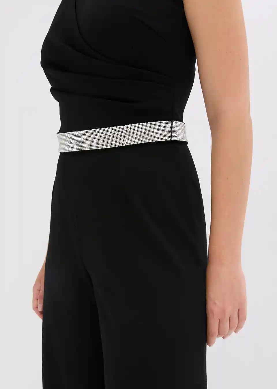 Modern und feminin: Overall aus strukturiertem Crepe mit Strassstein-Besatz am Ausschnitt und an der Taille