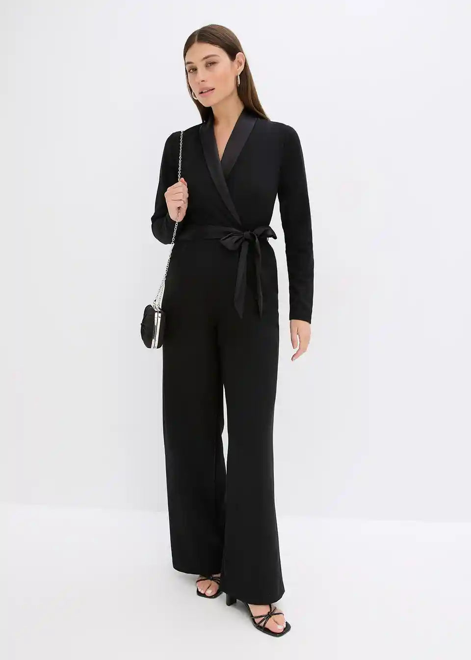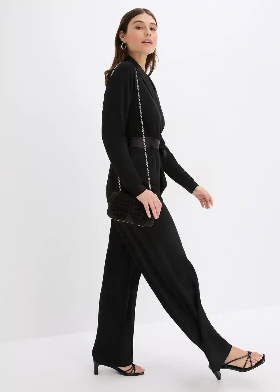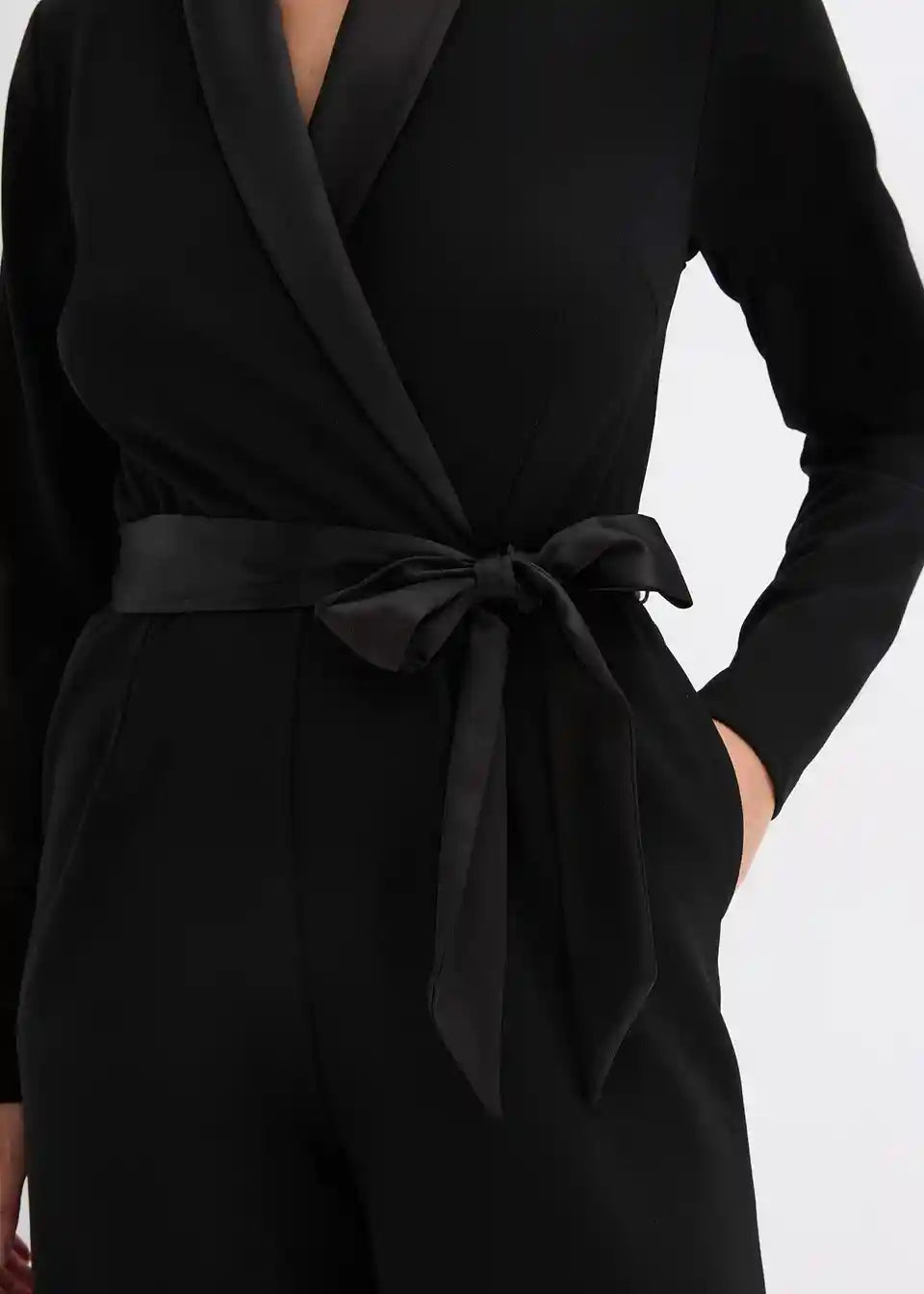 Modern und feminin: Overall aus strukturiertem Crêpe mit Satin-Einsatz in der Taille und am Kragen