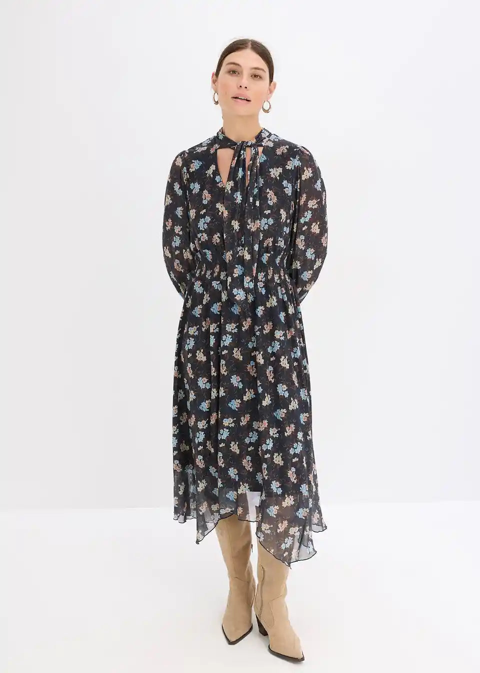 Modernes Kleid mit asymmetrischem Saum und schönem Druck