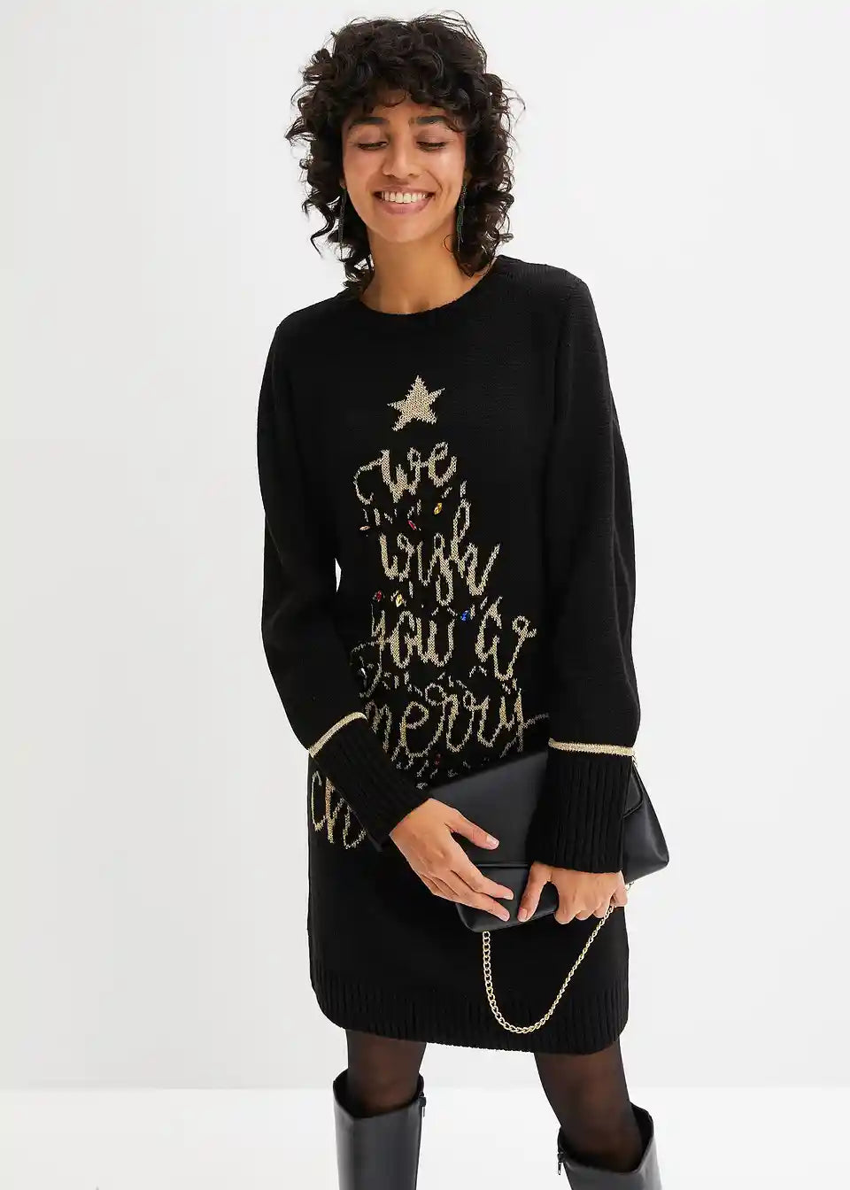 Feminines Strickkleid mit süßem Weihnachtsmotiv. Länge in Größe 36/38 ca. 90 cm.