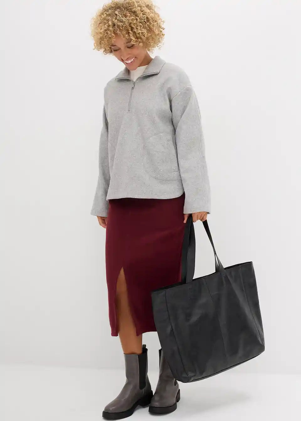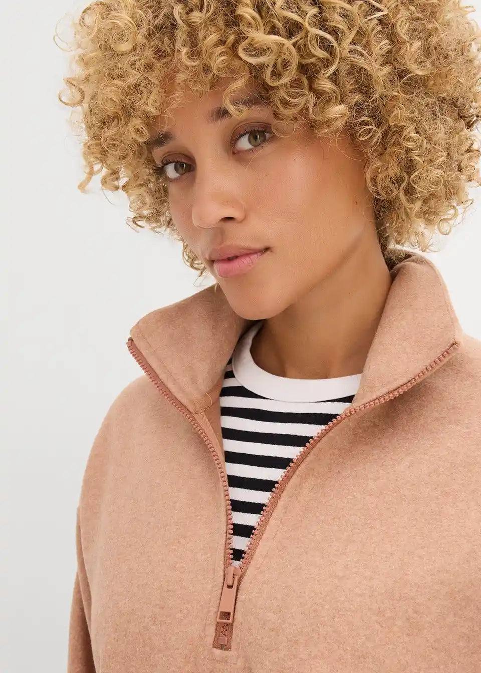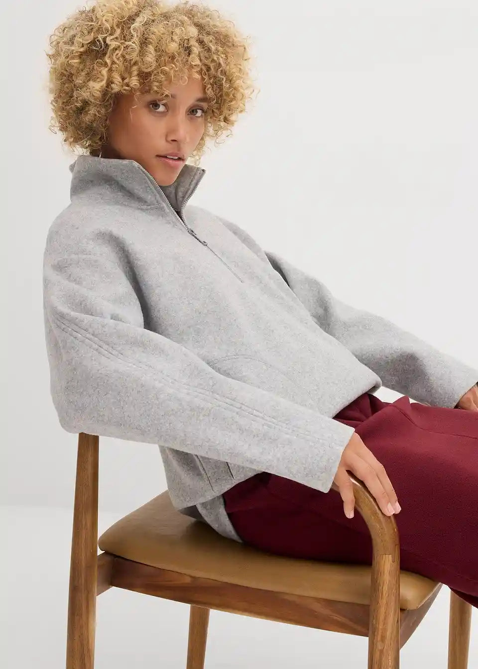 Oversize-Pullover mit hohem Stehkragen und Kurzreißverschluss. Überschnitten Schultern und seitliche Eingriffstaschen.