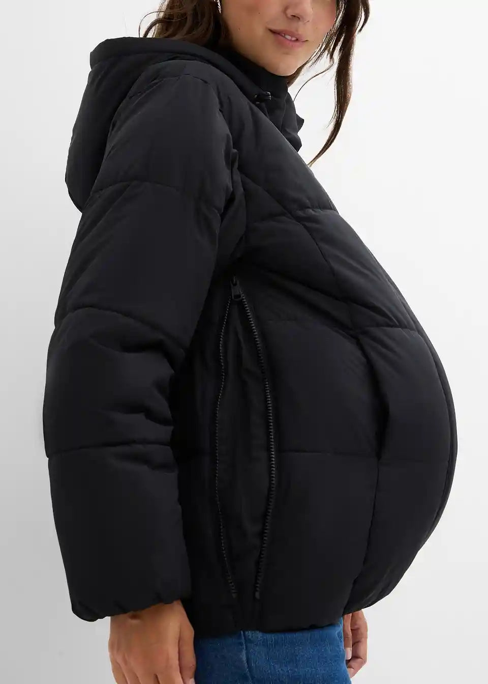 Diese wattierte und wasserabweisende Jacke ist ideal für Schwangerschaft und Tragezeit. Sie verfügt über einen herausnehmbaren Einsatz zum Tragen des Babys sowie eine Kapuze für Mutter und Kind, beide mit verstellbaren Kordelzügen. Der Einsatz ist zusätzlich mit Druckknöpfen versehen, um den Hals der Mutter angenehm zu wärmen. Elastische Bündchen an Ärmeln und Saum schützen zuverlässig vor Kälte und Wind. Seitliche Reißverschlüsse sorgen für zusätzliche Weite im Bauchbereich und machen die Jacke flexibel einsetzbar: vor, während und nach der Schwangerschaft. Mit praktischen Taschen für wichtige Alltagsgegenstände.