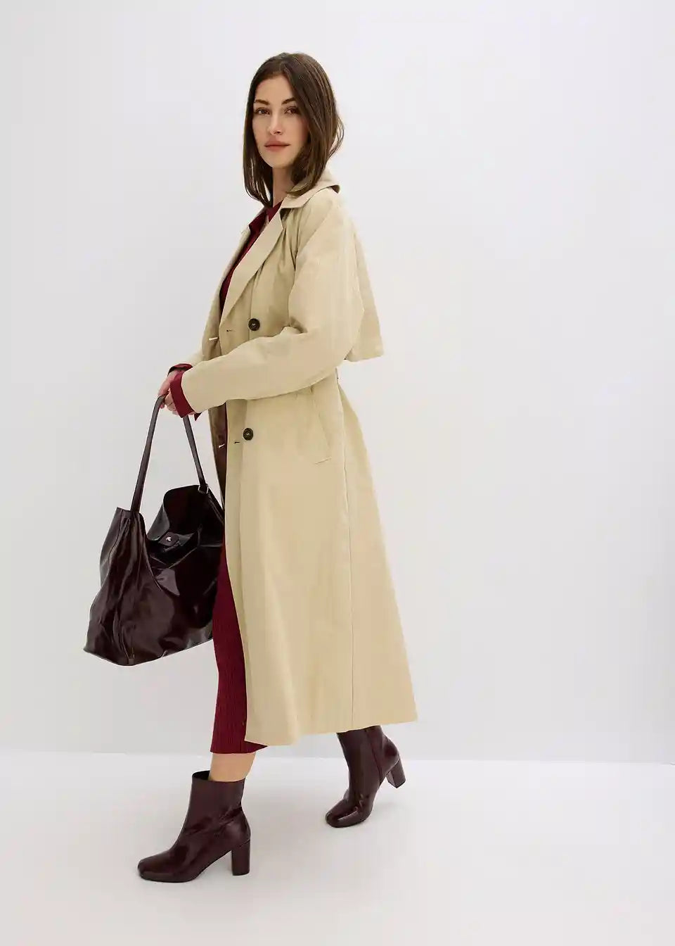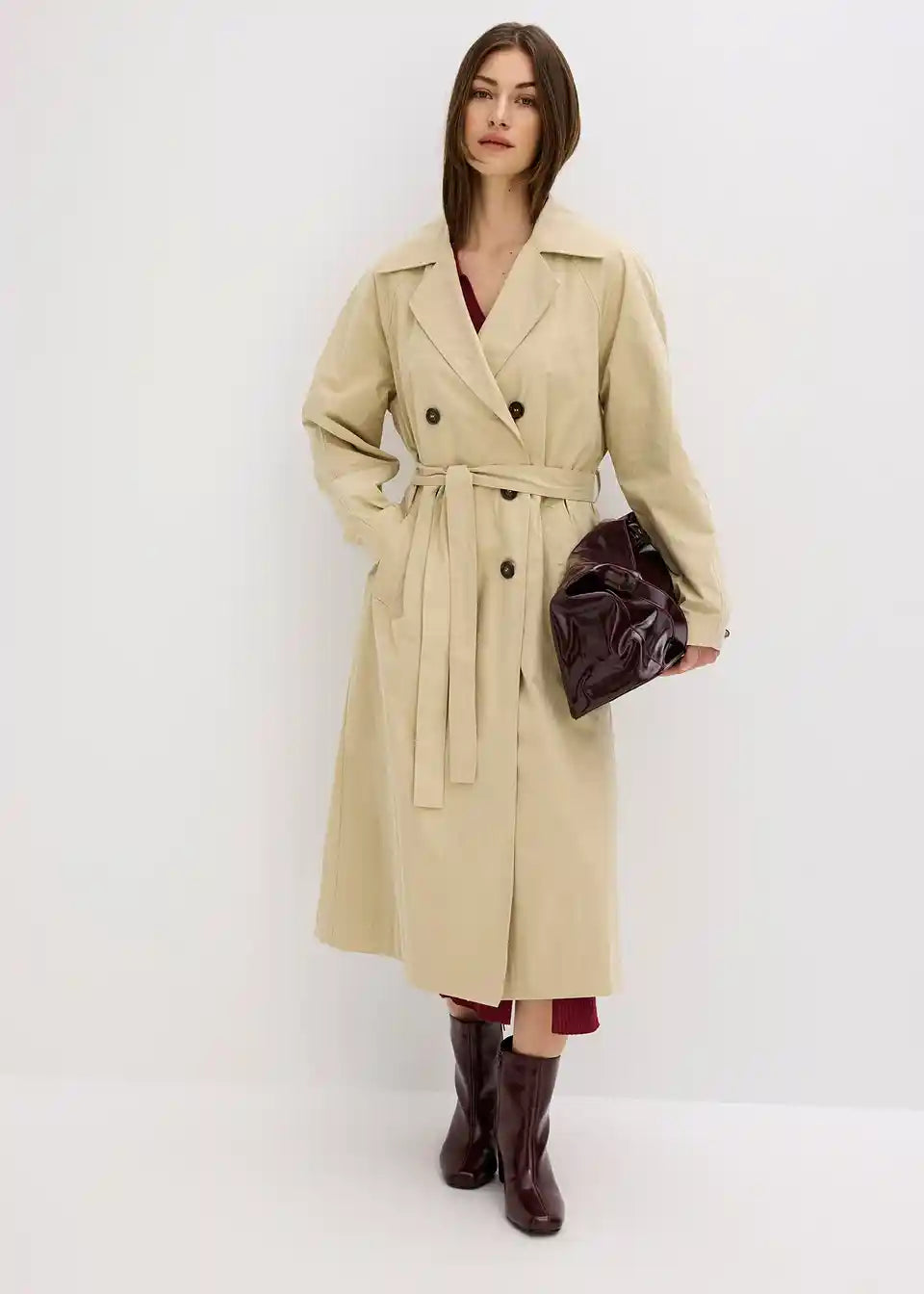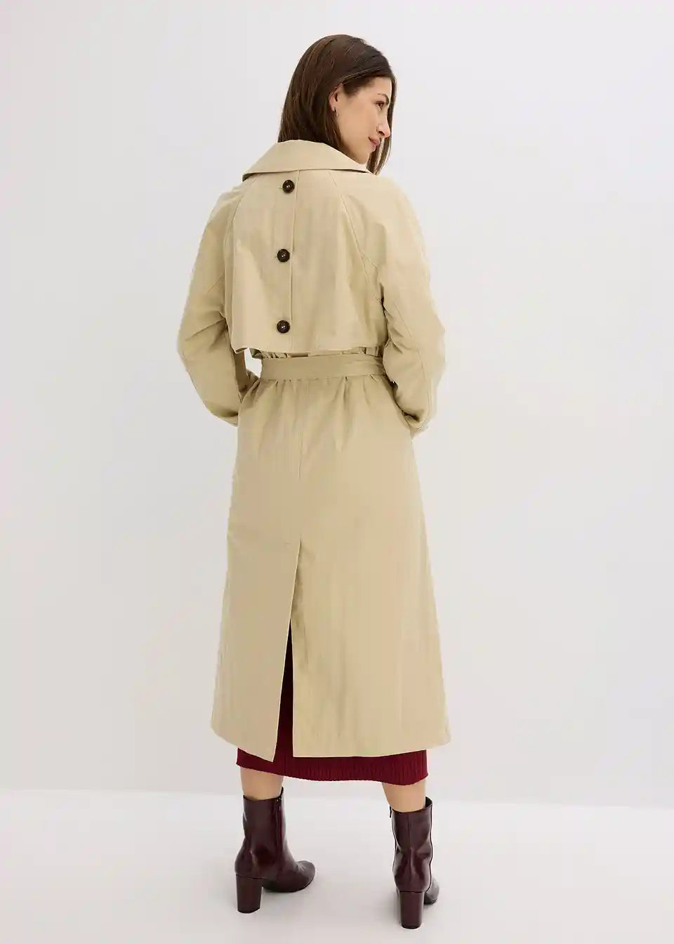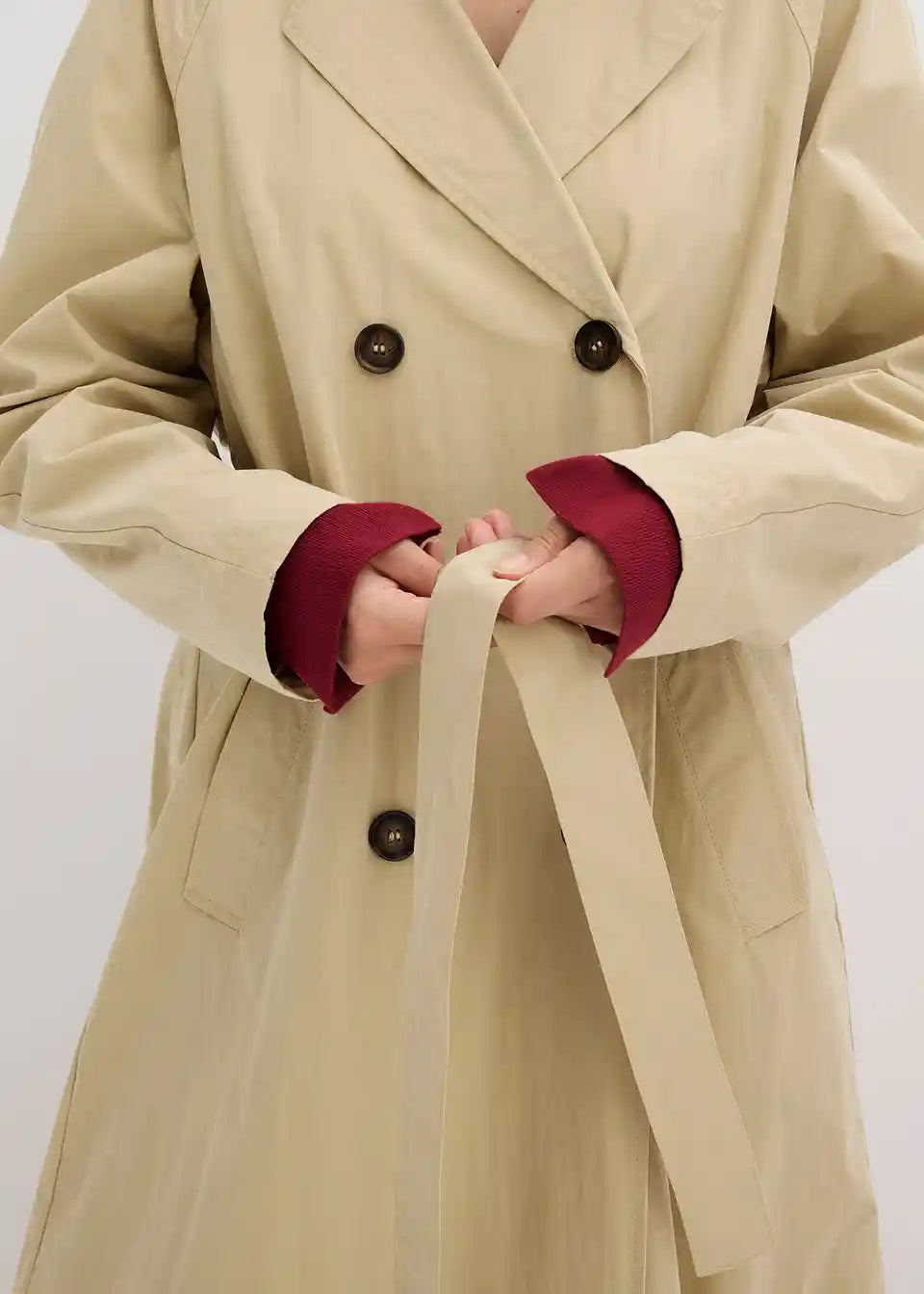 Zweireihiger Trenchcoat mit Bindegürtel in der Taille sowie schrägen Leistentaschen