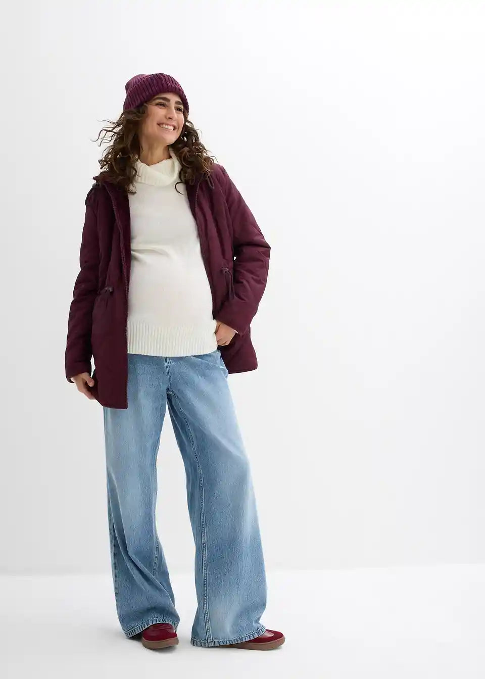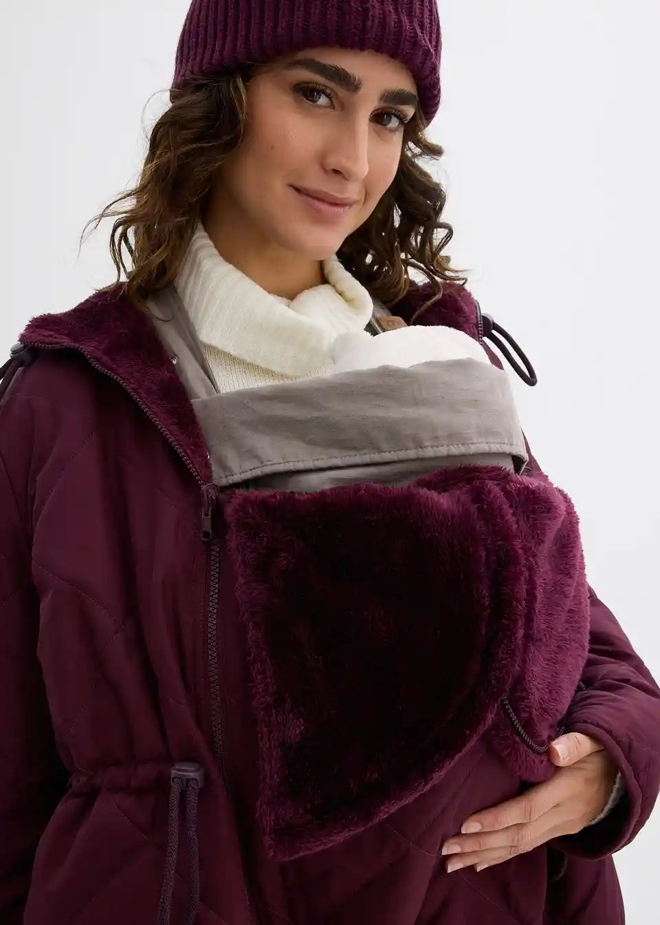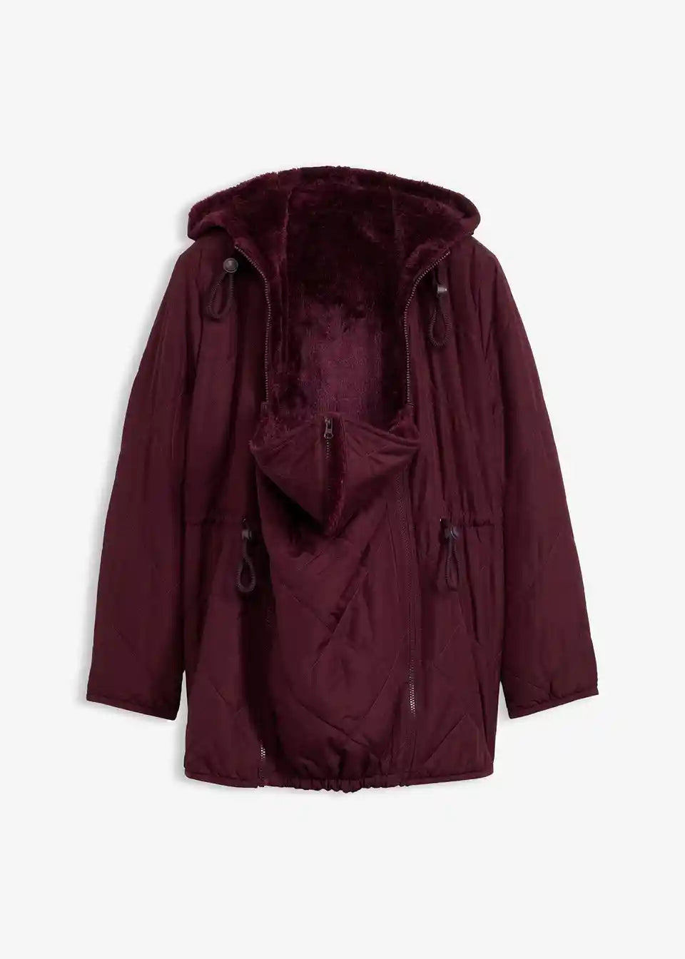 Kuschelige Wendejacke mit zwei Seiten: eine flauschige Teddyseite und eine gesteppte, leicht wattierte Seite. Sie verfügt über eine große Kapuze mit Kordelzügen für die Mutter und eine kleine für das Baby, die sich per Reißverschluss öffnen lässt. Taschen auf beiden Seiten bieten Platz für wichtige Dinge. Ein Kordelzug in der Taille sorgt für eine schöne Silhouette. Der abgerundete Saum mit seitlichen Schlitzen bietet zusätzliche Bewegungsfreiheit und Platz für den wachsenden Babybauch.