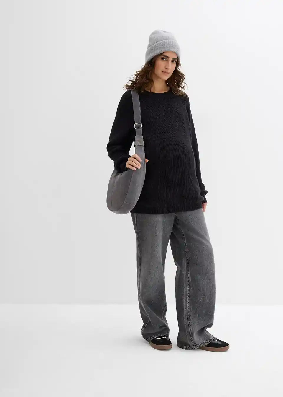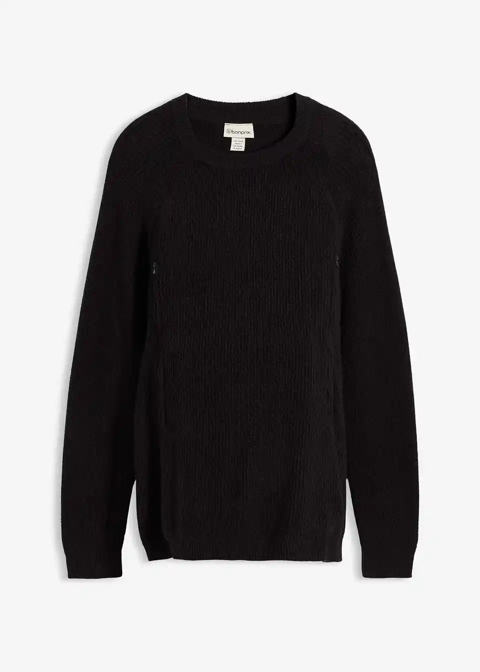 Weicher Pullover aus grobmaschigem Strick für die Schwangerschaft und danach mit Rundhalsausschnitt. An den Seiten sind kaum sichtbare Reißverschlüsse eingearbeitet, die sich bequem zum Stillen öffnen lassen. Die Reißverschlüsse sind zum Schutz des Babys mit Stoff unterlegt und verhindern außerdem den direkten Hautkontakt.