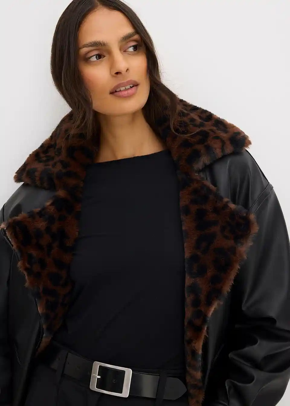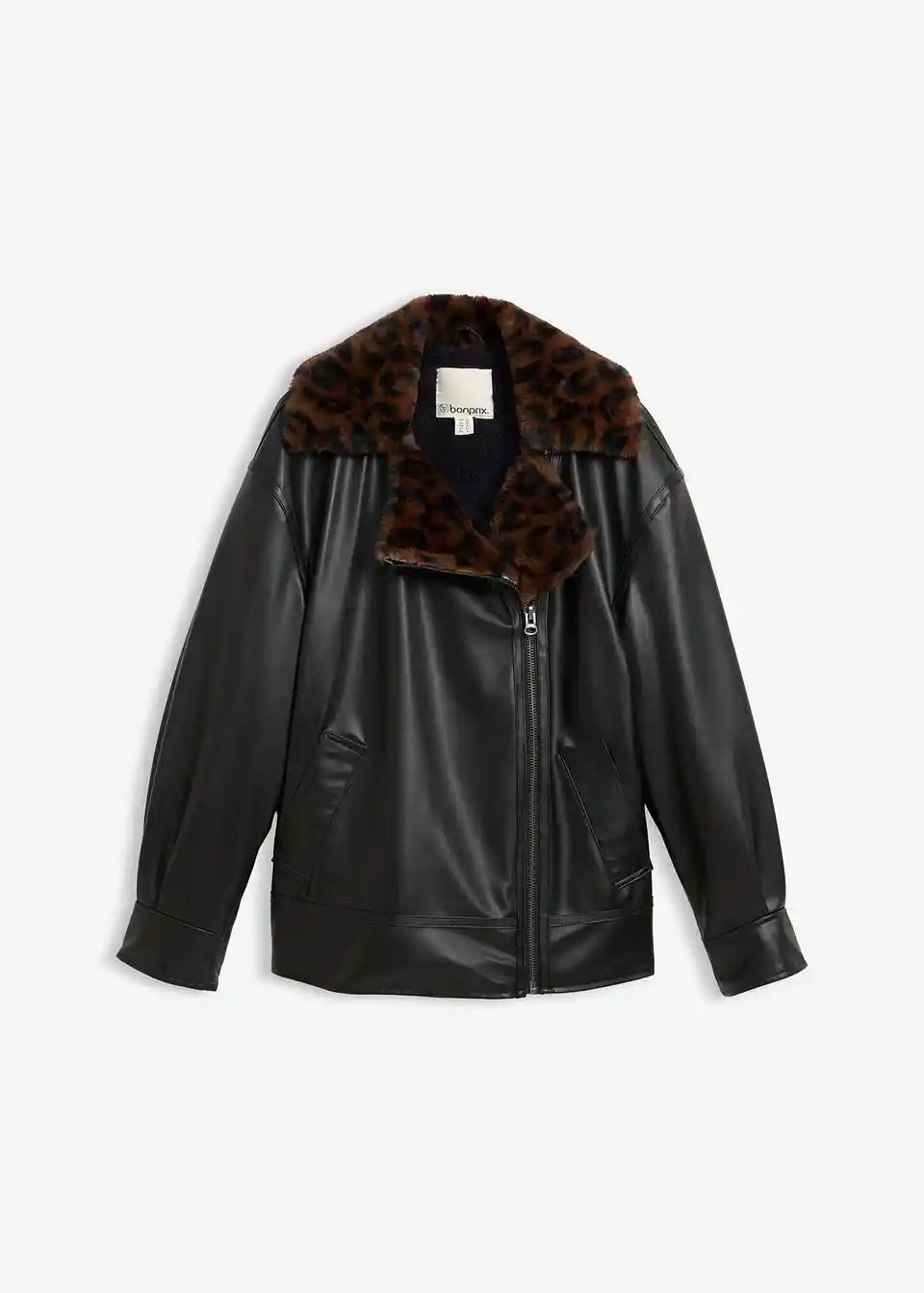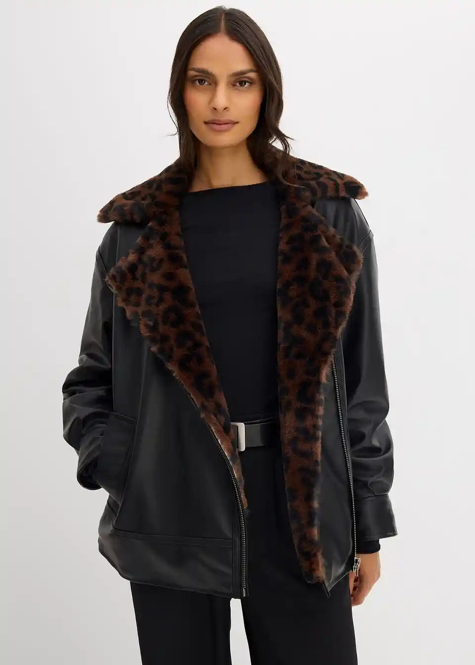 Trendige Oversize Lederimitat-Jacke mit Leoparden Kunstfell