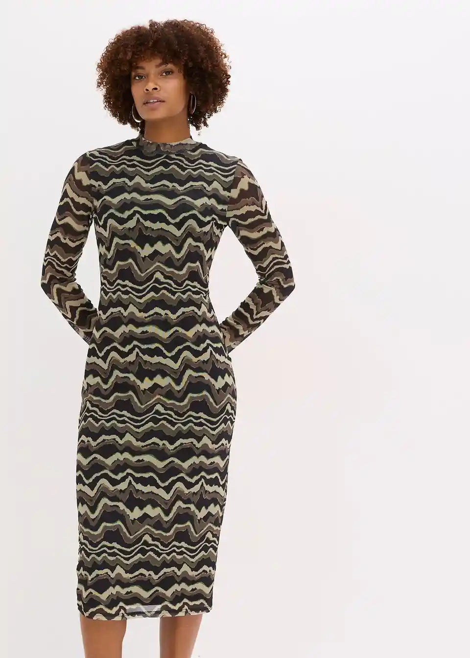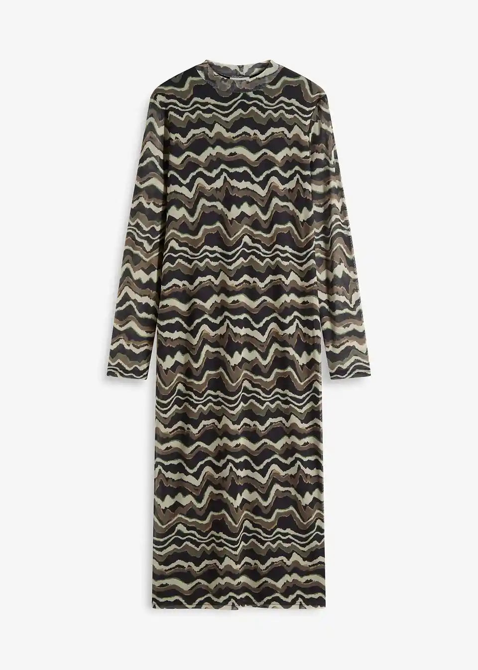 modisch bedrucktes Jersey-Midikleid aus softem Mesh mit Stehkragen