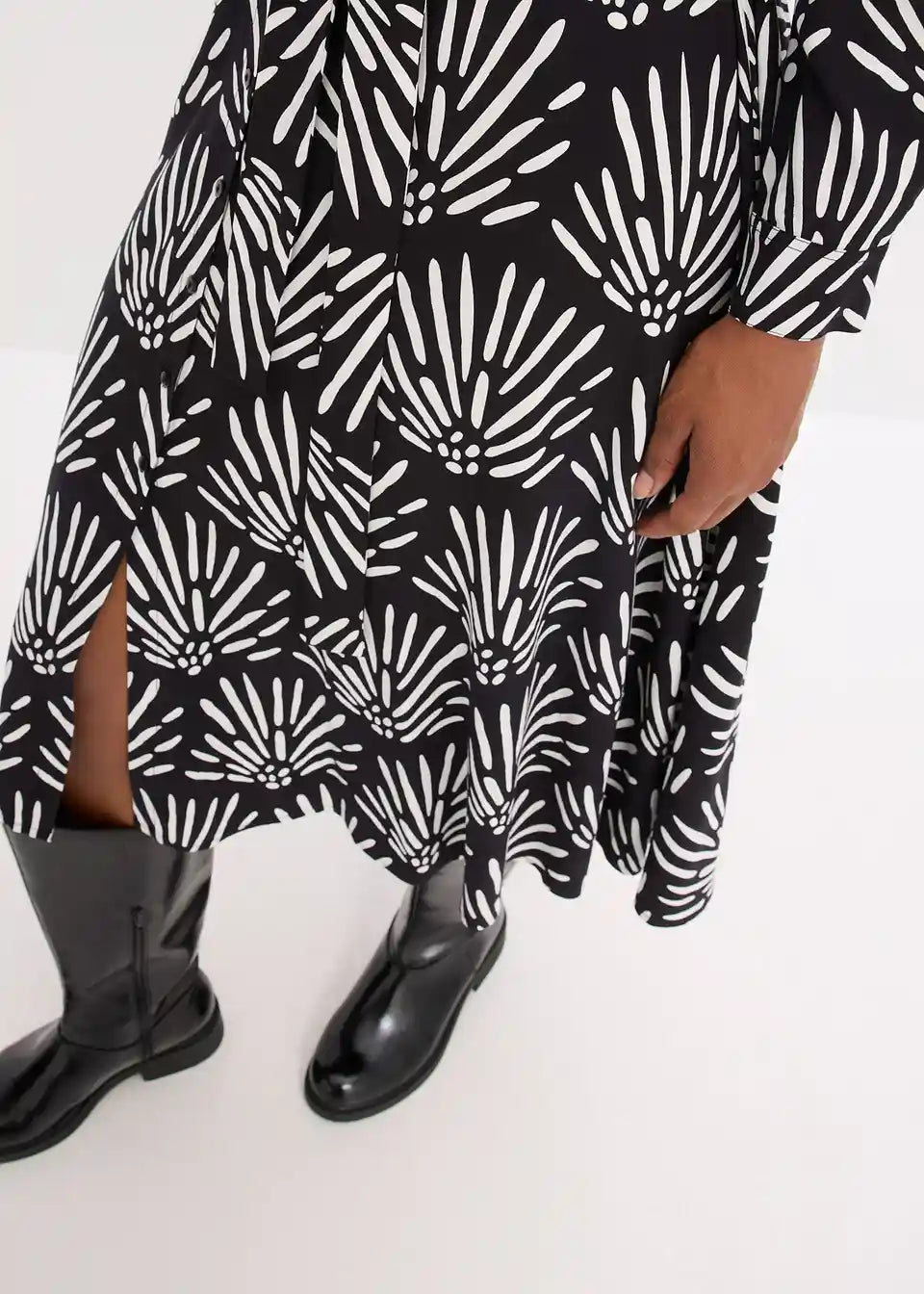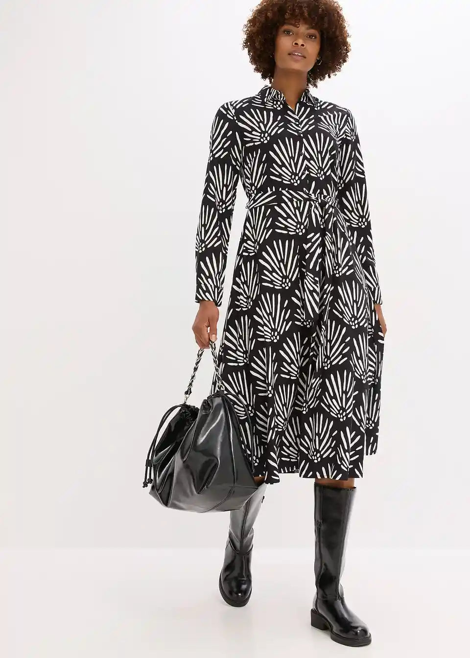 modisch bedrucktes Blusenkleid in Midilänge mit dünnem Lederimitat-Gürtel in der Taille