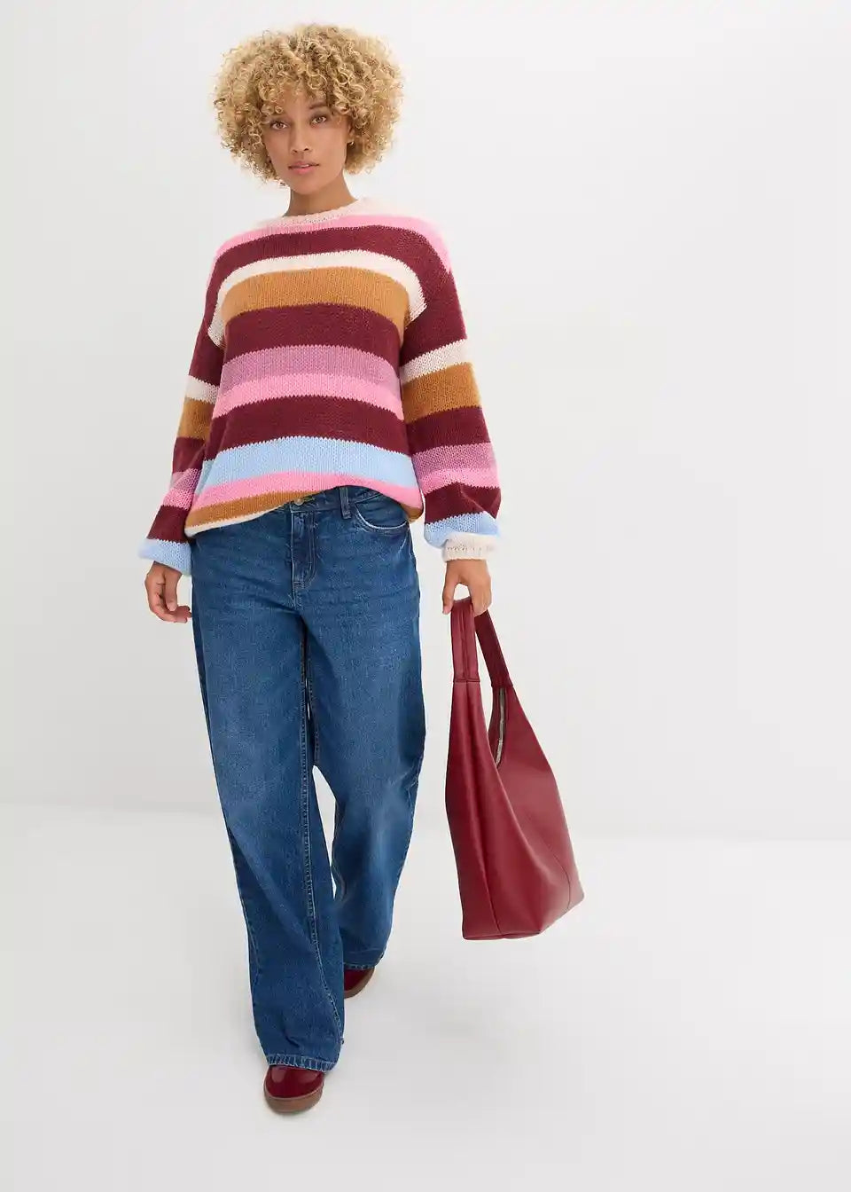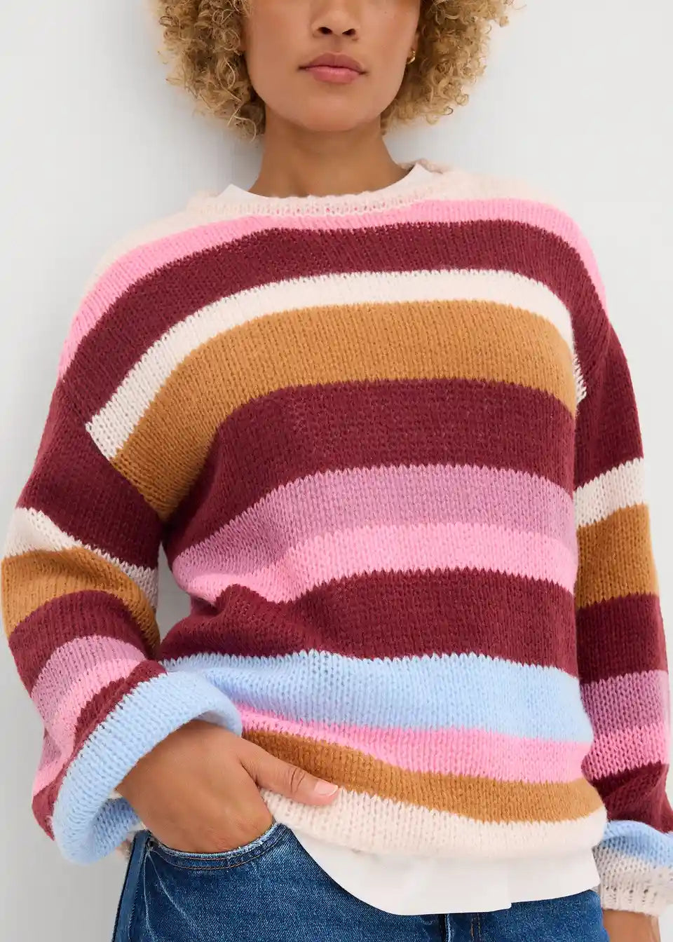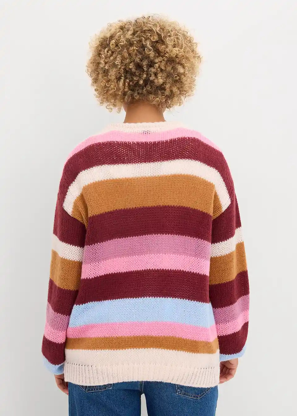 Hüftbedeckender Strickpullover mit überschnittener Schulter und Rundhalsausschnitt. Weite Passform.