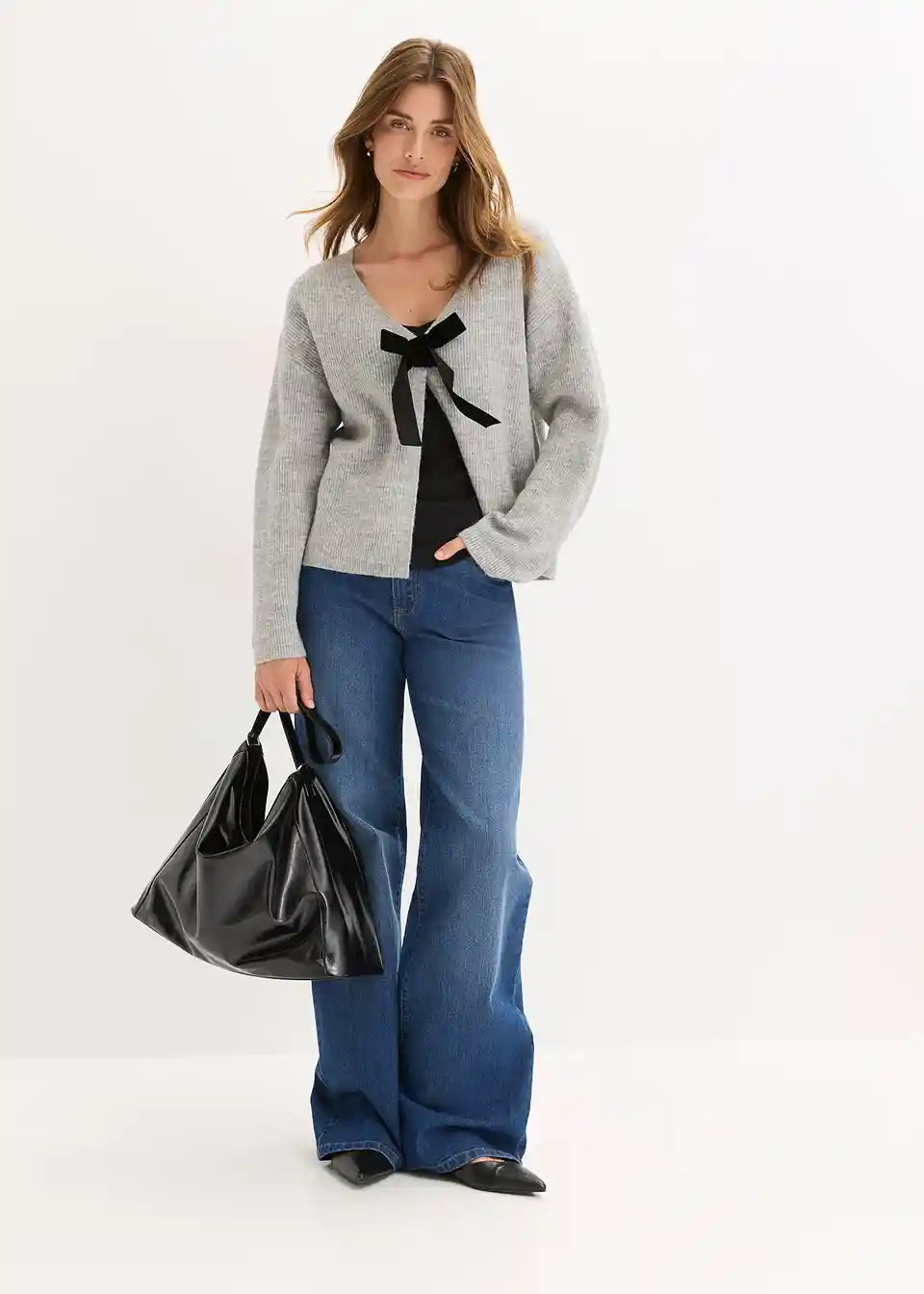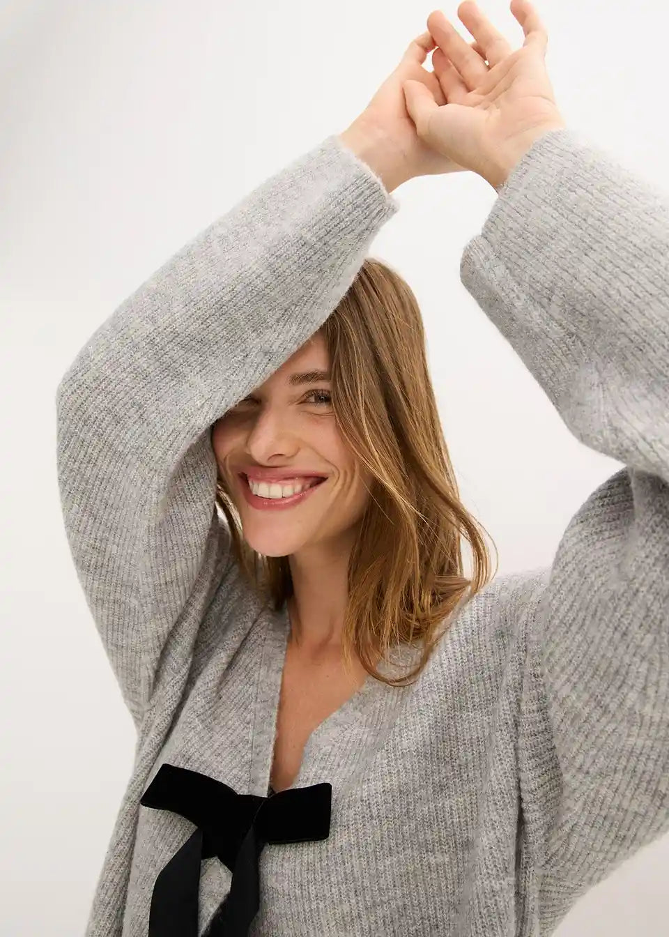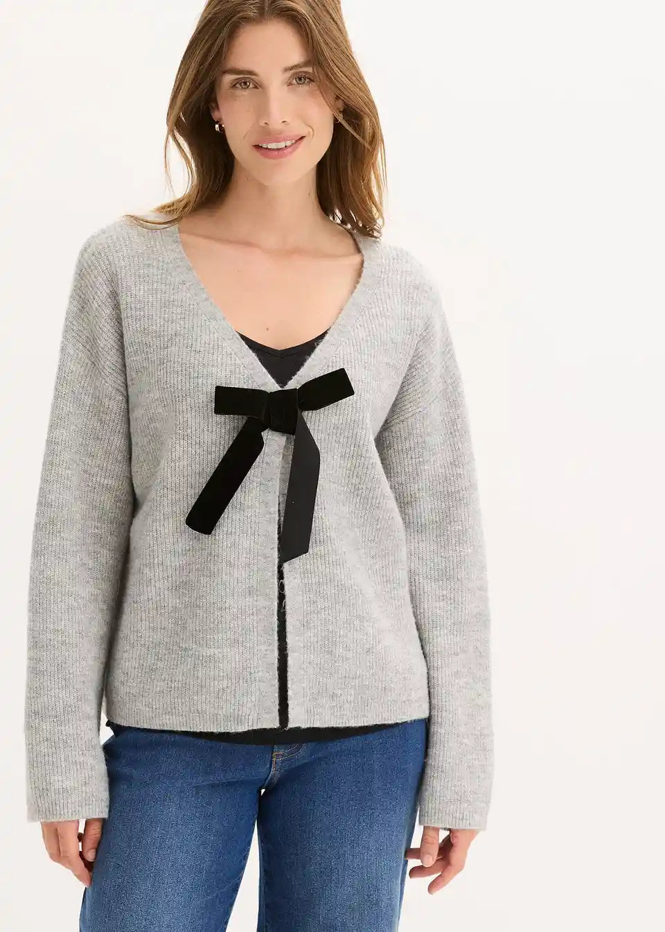 Moderne geschlossene Strickjacke mit dekorativer Schleife