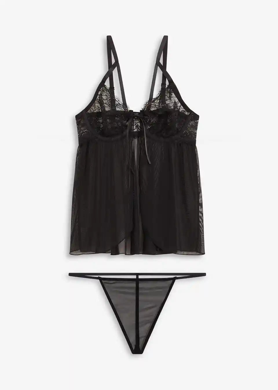Babydoll + String (2-tlg.Set) aus feiner Spitze und transparentem Mesh.