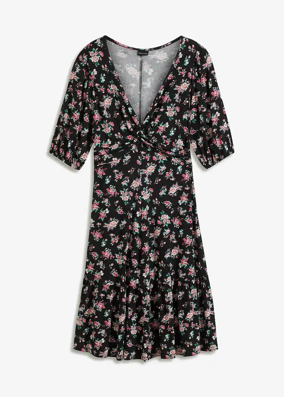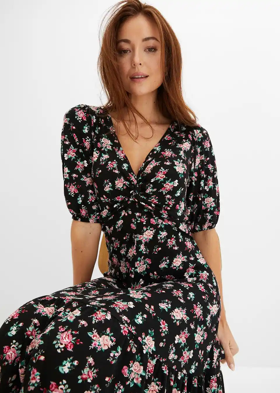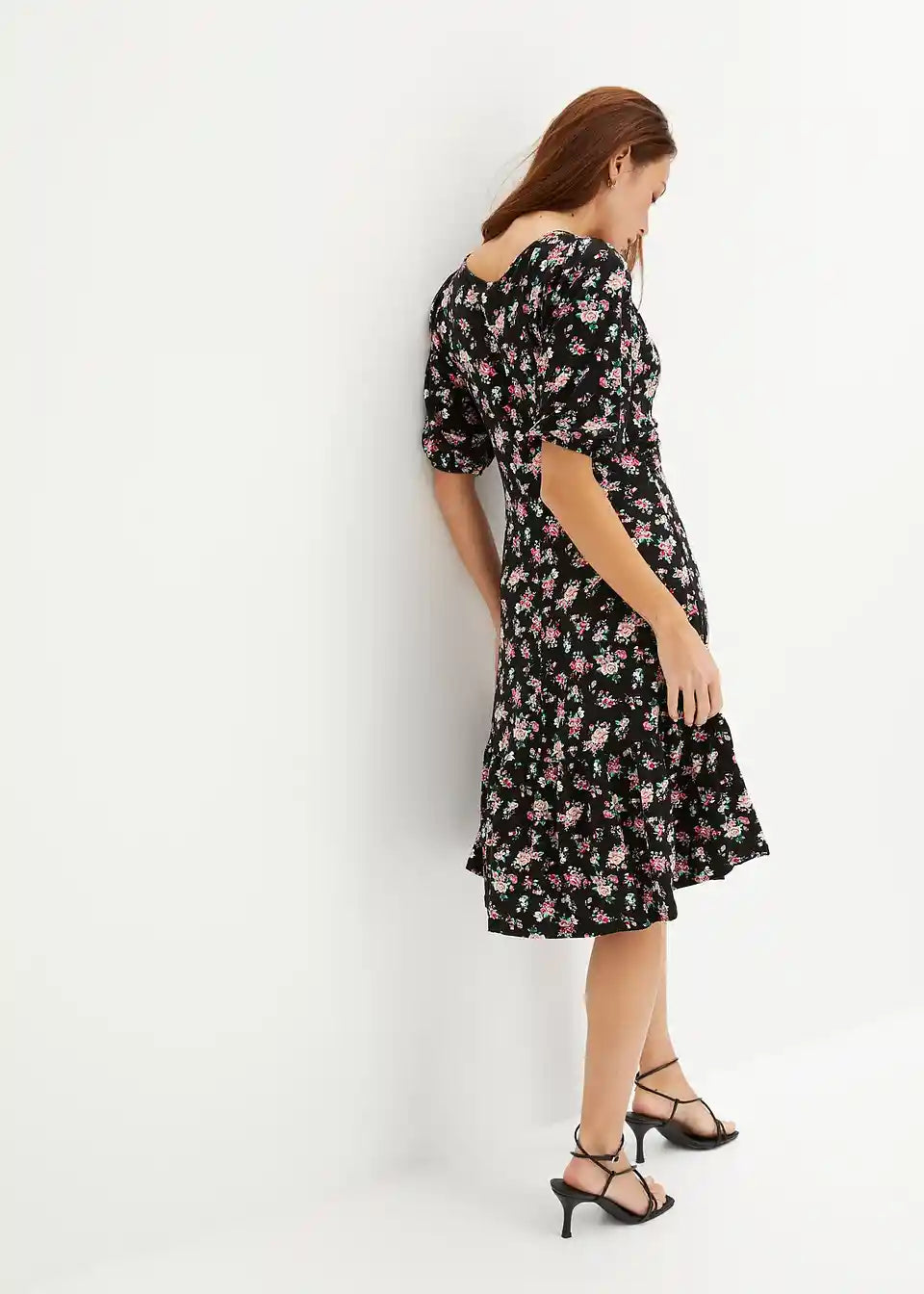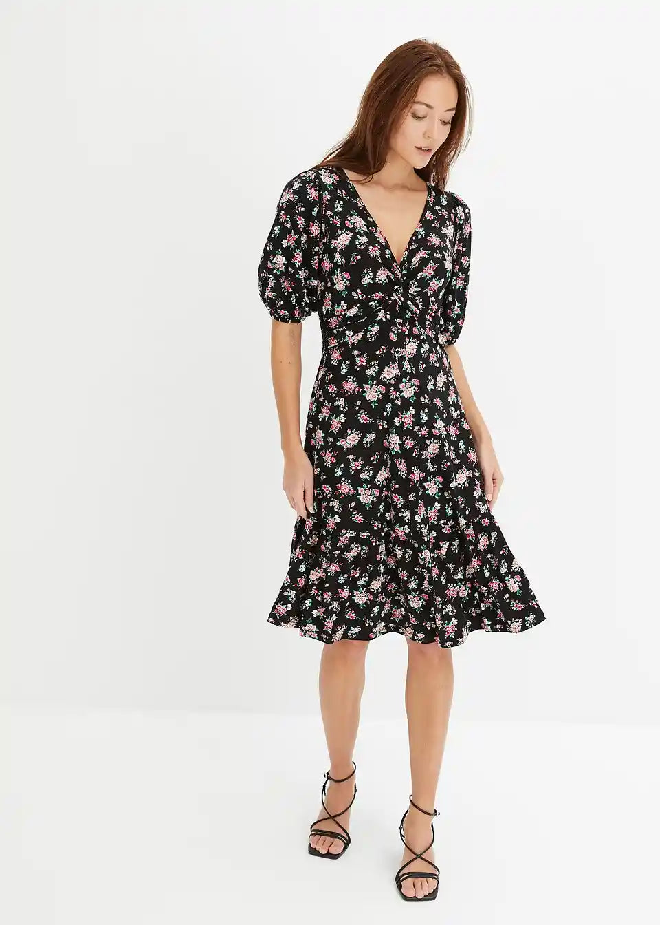 Modernes Kleid mit Raffung, Volant und Puffärmel