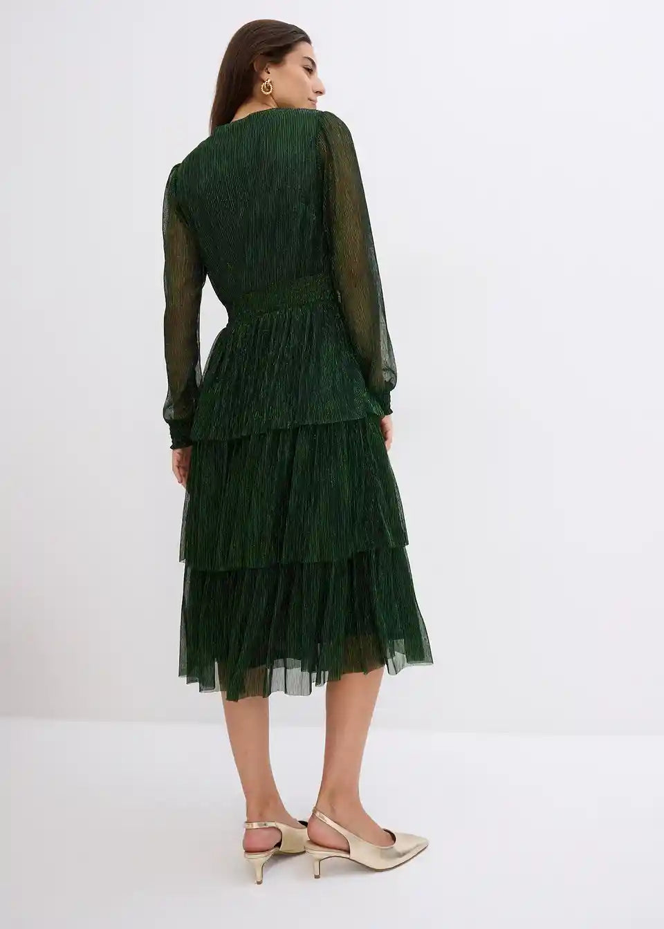 Das Kleid umspielt sehr schön die Figur, fällt auch recht großzügig aus, hätte es auch eine Nummer kleiner nehmen können, aber durch den Gummi im Taillienbereich fällt das nicht auf. Es hat eine schöne grüne Farbe, der Lurex ist nicht zu auffällig, so das