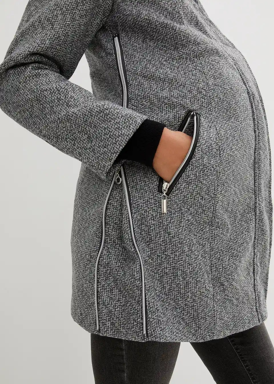Der Umstands-Kurzmantel lässt sich dank der seitlichen, weitenverstellbaren Reißverschlüsse die gesamte Schwangerschaft und darüber hinaus tragen.