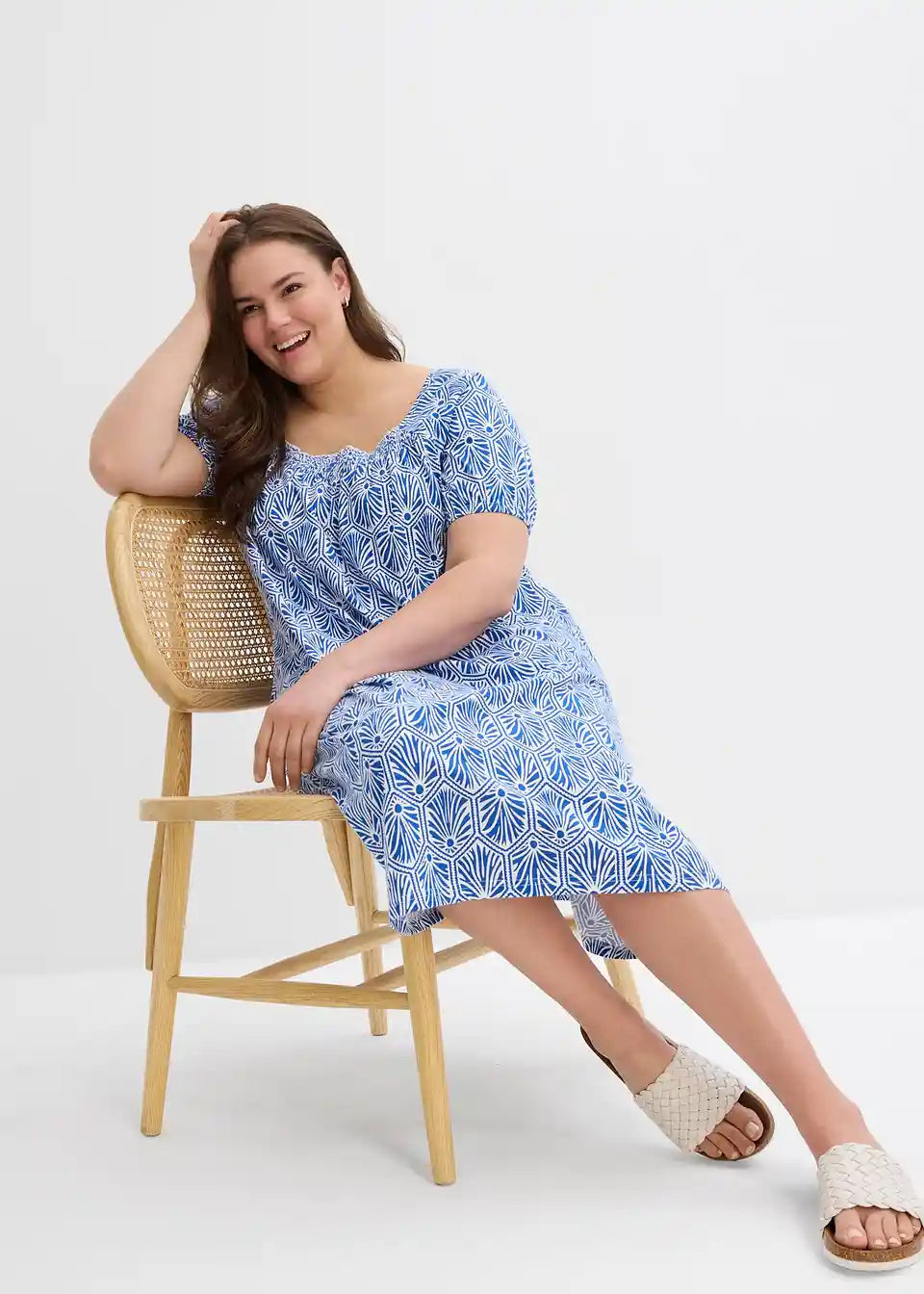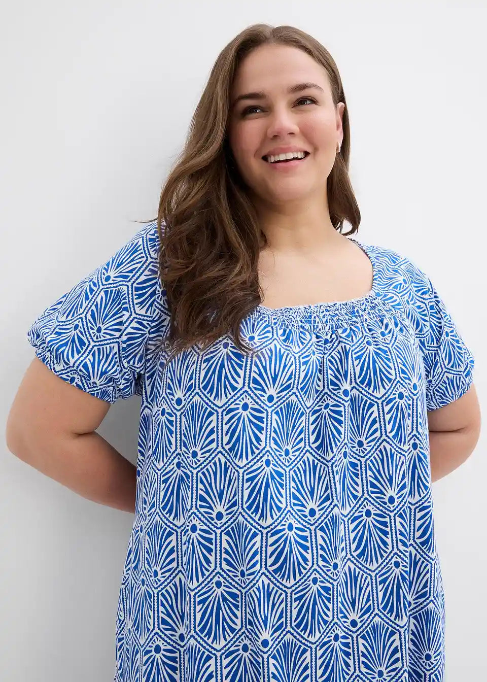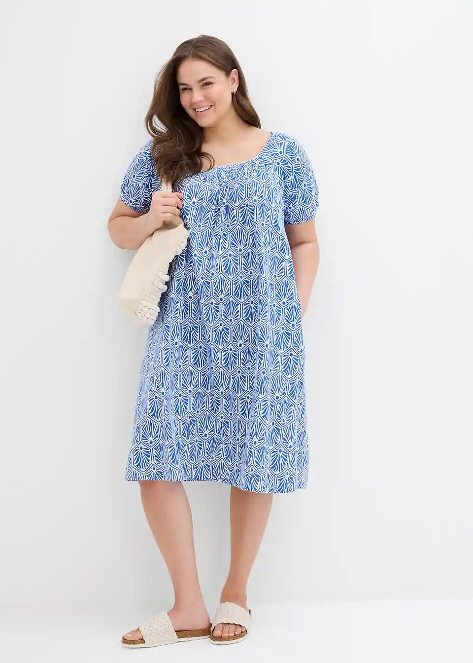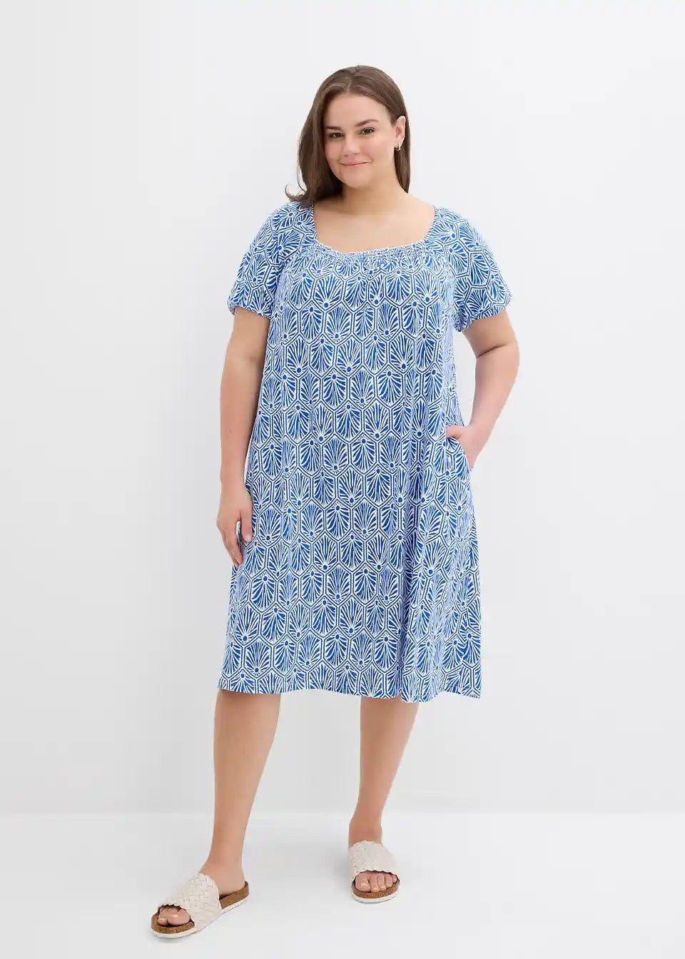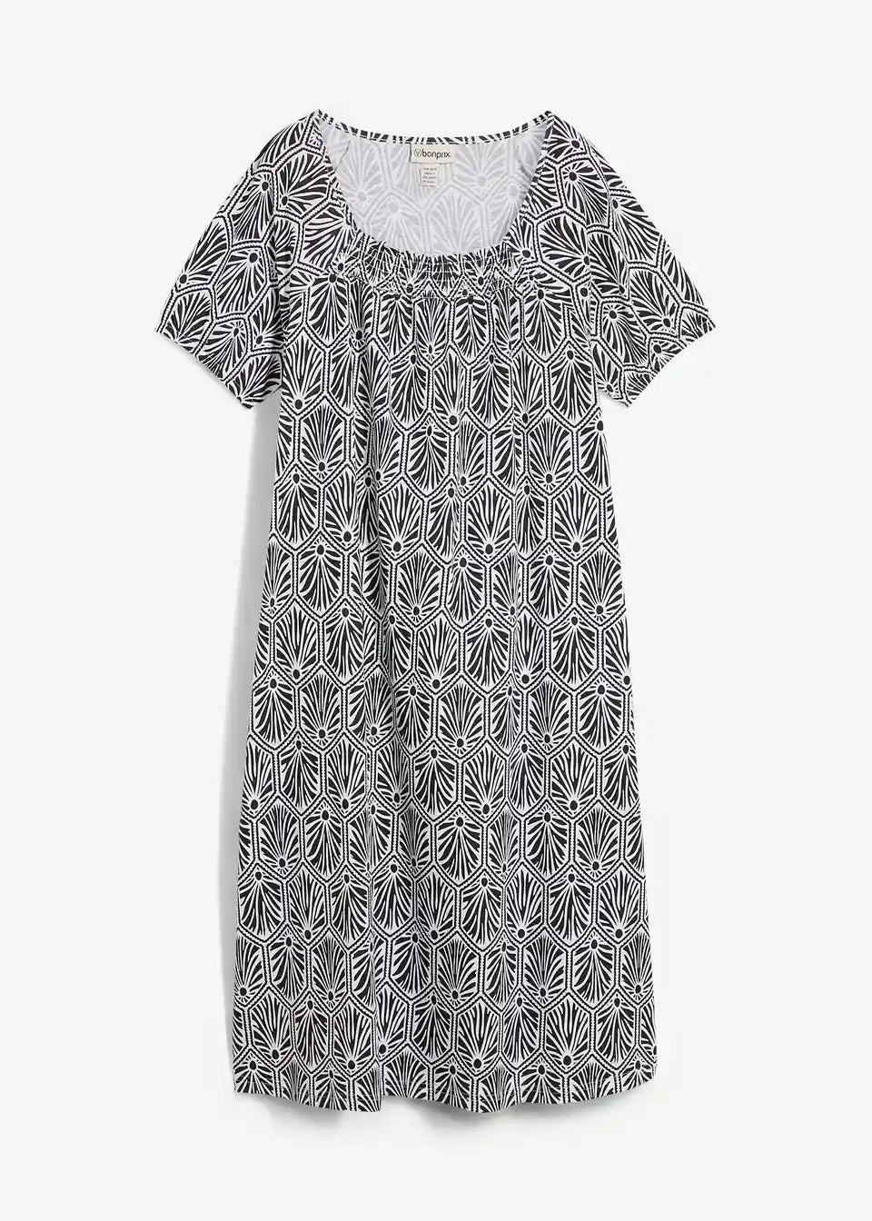 Baumwollkleid in leichter A-Linie mit elastischem Karree-Ausschnitt sowie kurzen Ärmel mit elastischem Abschluss.