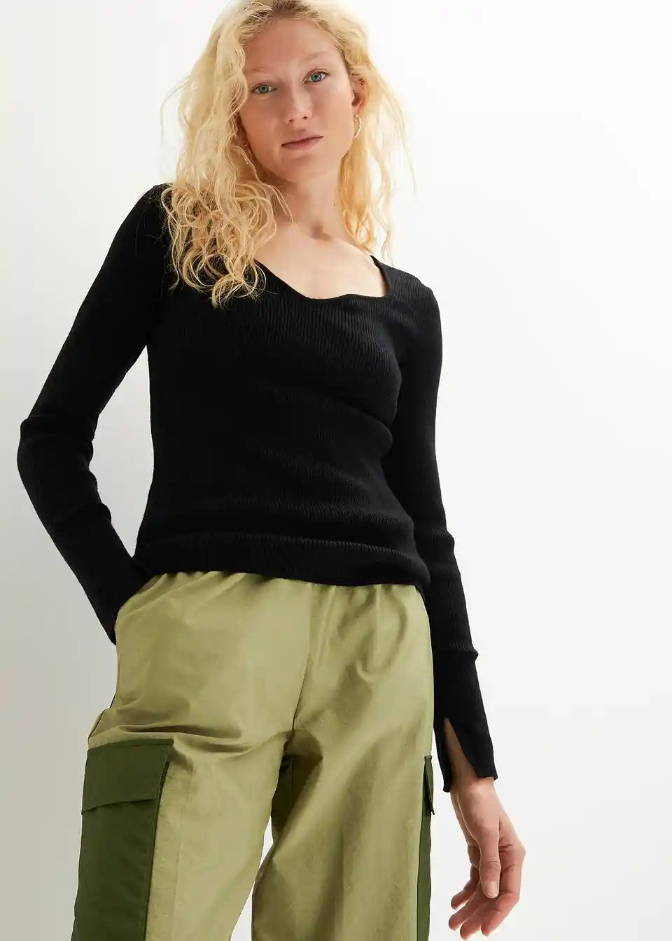 Hübscher weicher Pulli mit schönem Ausschnitt. Passt mir mit Brustumfang 80B und Taillenumfang 74 cm perfekt. Die Länge reicht über den Hosenbund, so dass nichts verrutscht, wenn man die Arme hebt oder sich setzt, Das Material ist nicht zu dick, eher leic