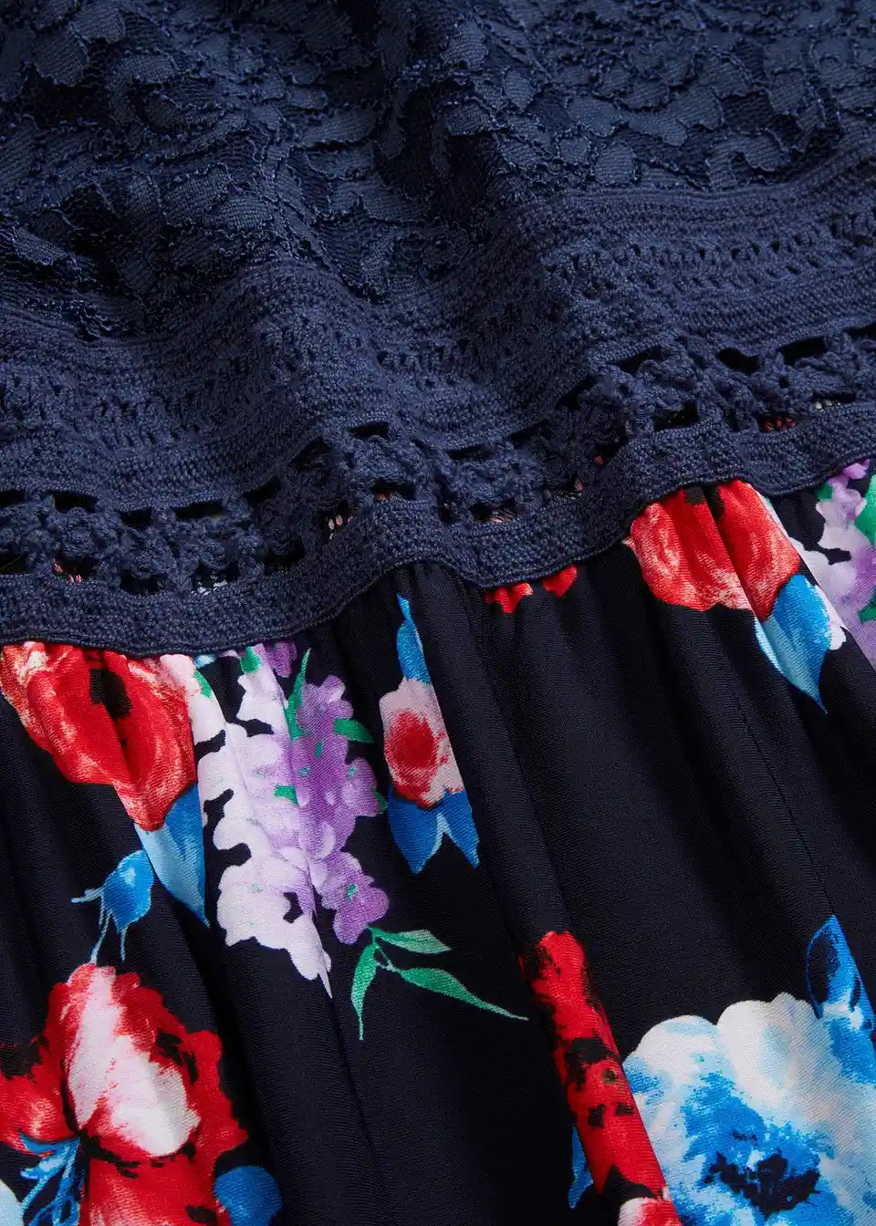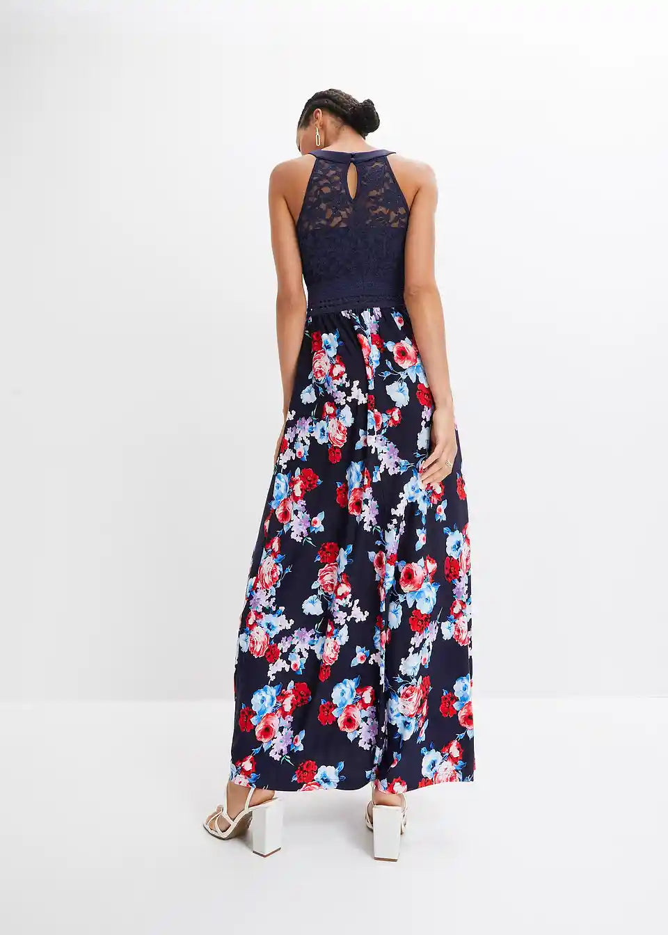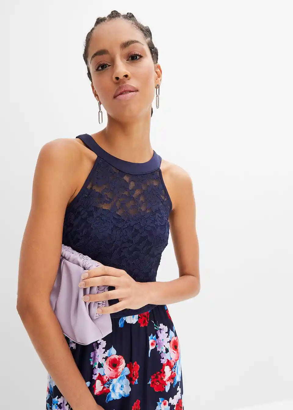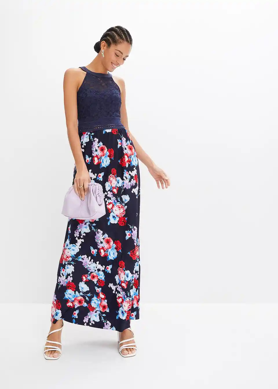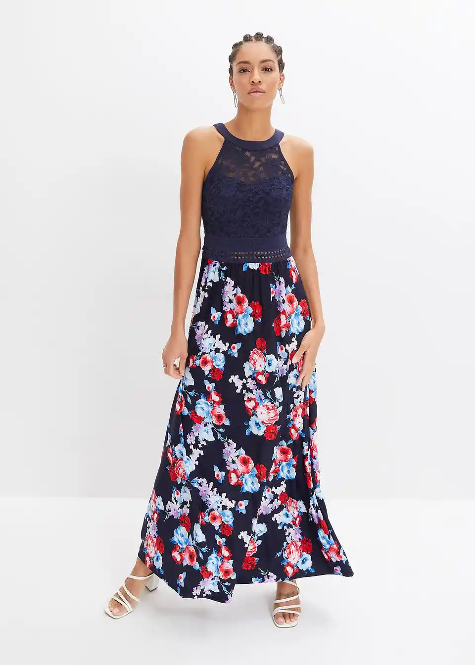 Tolles Kleid allein durch den Neckholder und das Spitzenmaterial das ganz weich ist. Der bunte Blumendruck im Unteremrock ist ein toller Kontrast.Es sieht sehr elegant aus und ist zu jeder Festlichkeit super zu tragen.Der Preis war der Hammer da ich es au