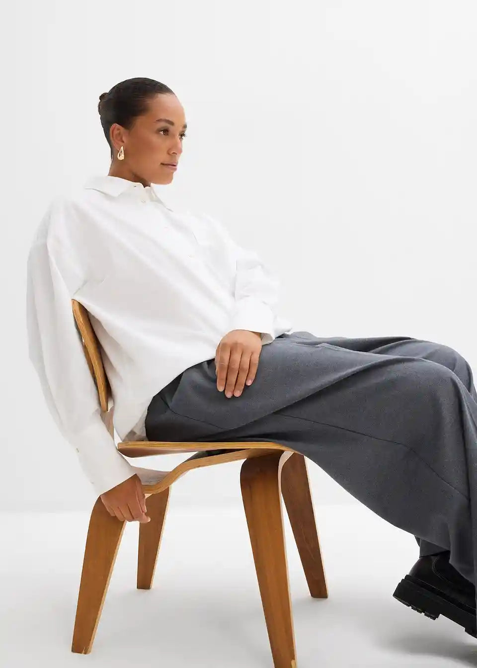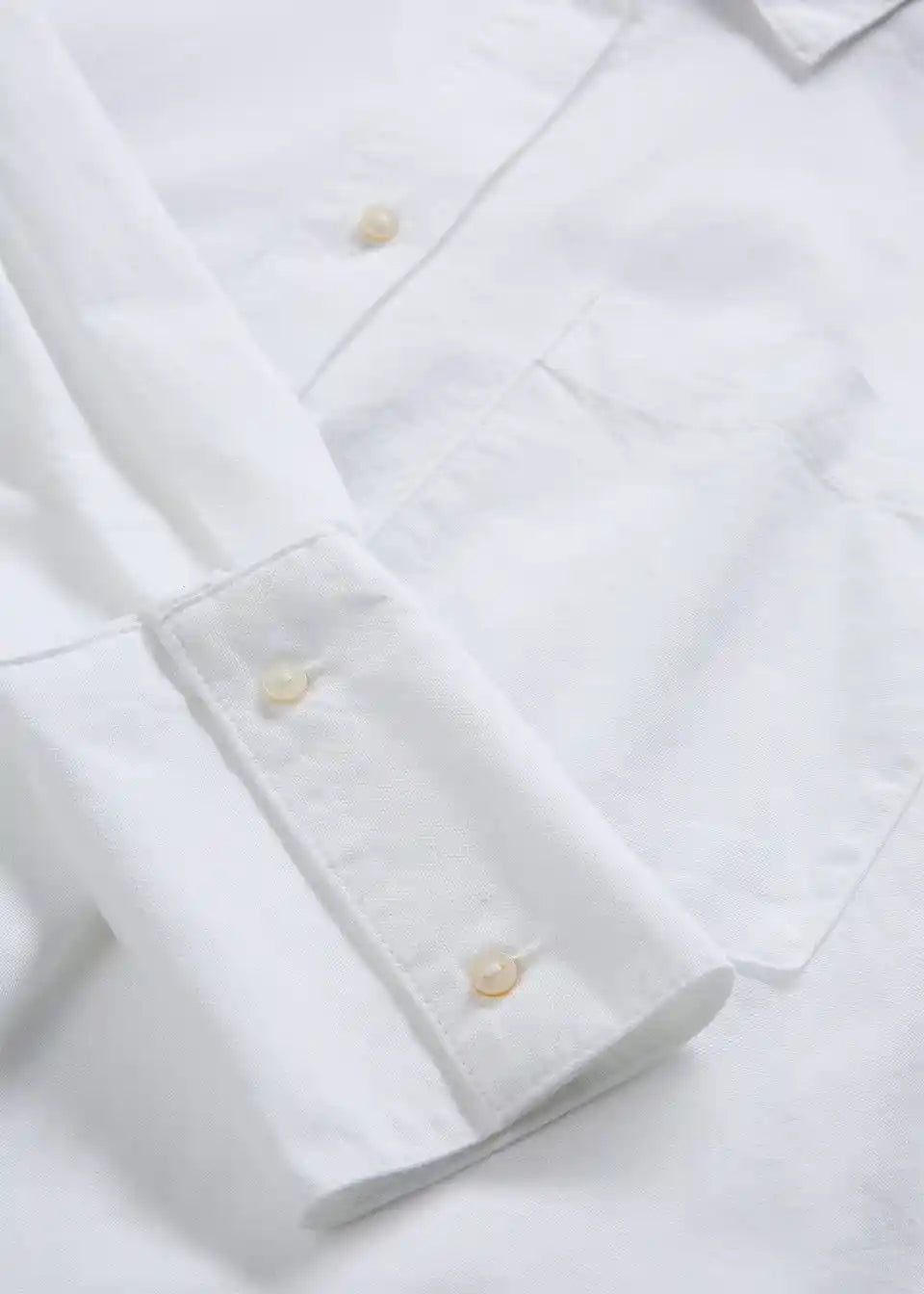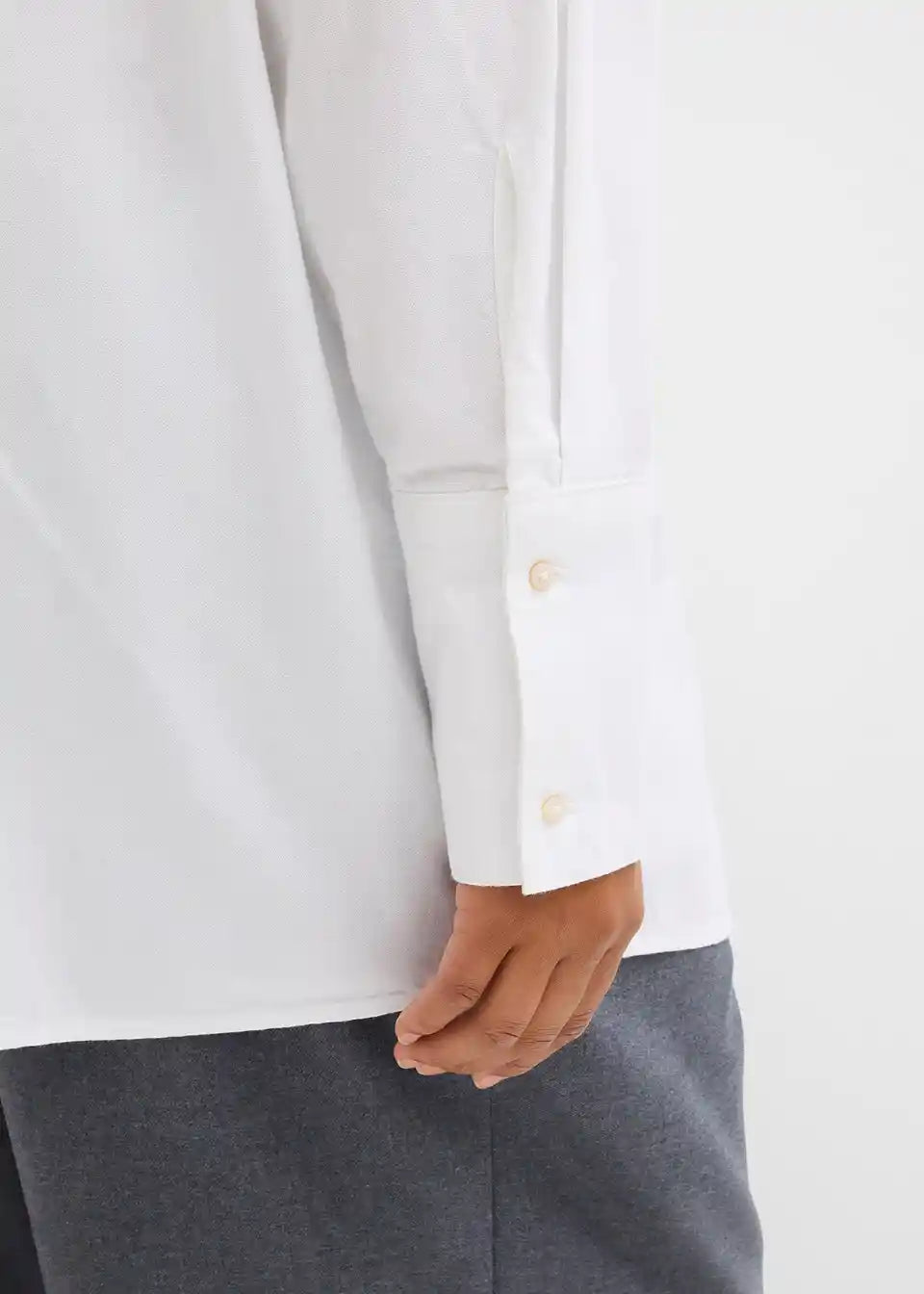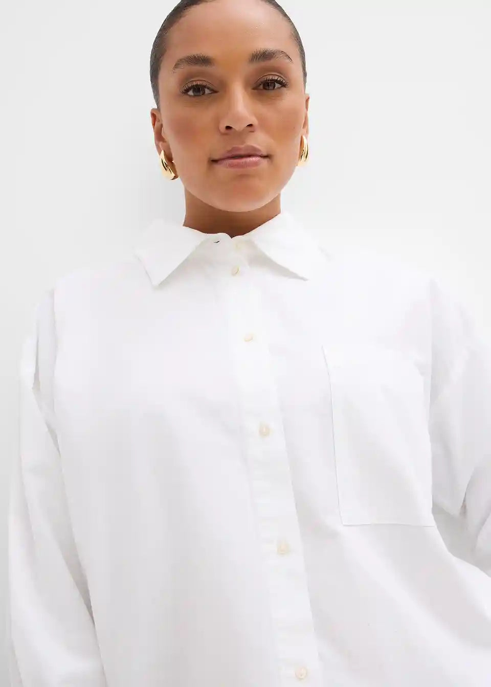 Oversized Bluse aus festem Bio-Baumwoll-Oxford mit Kragen, Knöpfen vorne und einer offenen Brusttasche. Lange Ärmel mit geknöpften langen Manschetten.