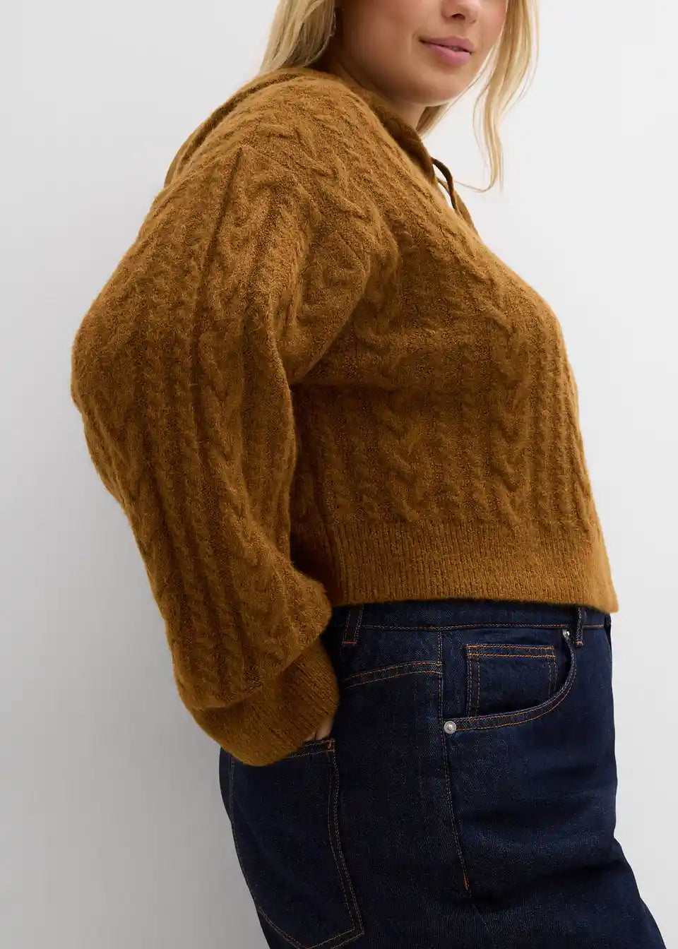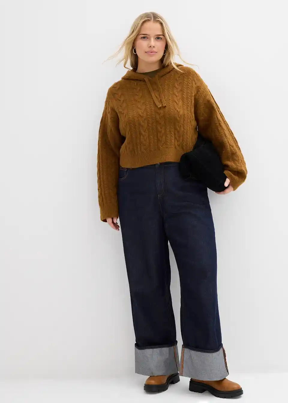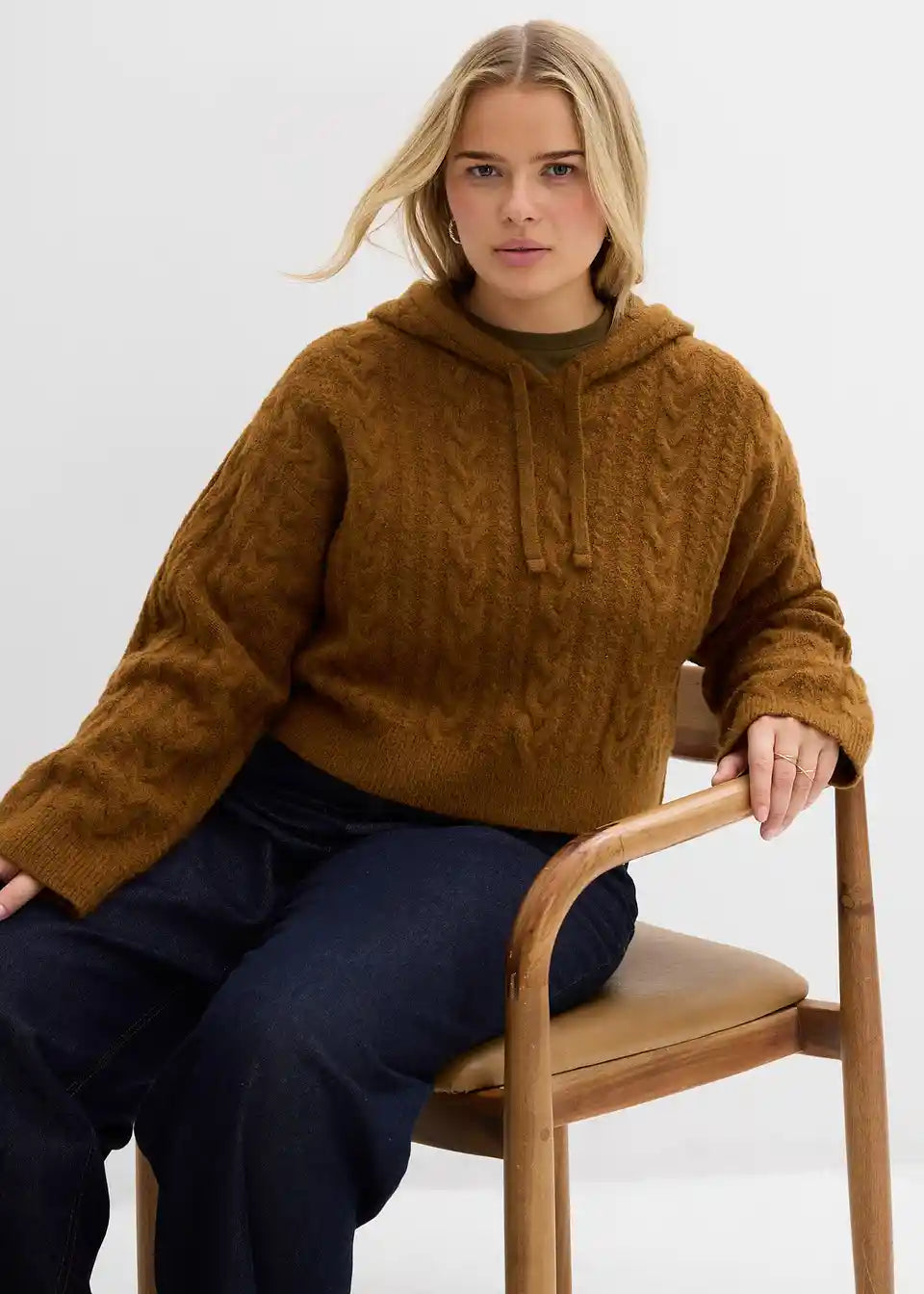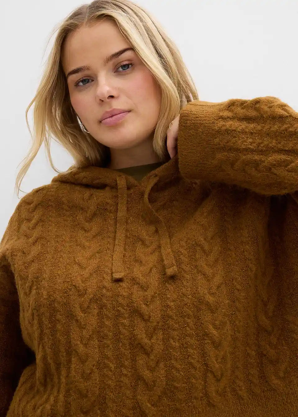 Modischer Grobstrick-Pullover mit Kapuze und Zopfmuster