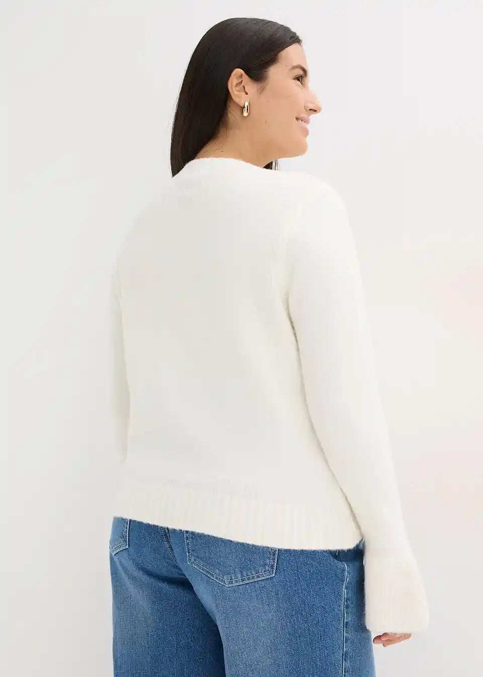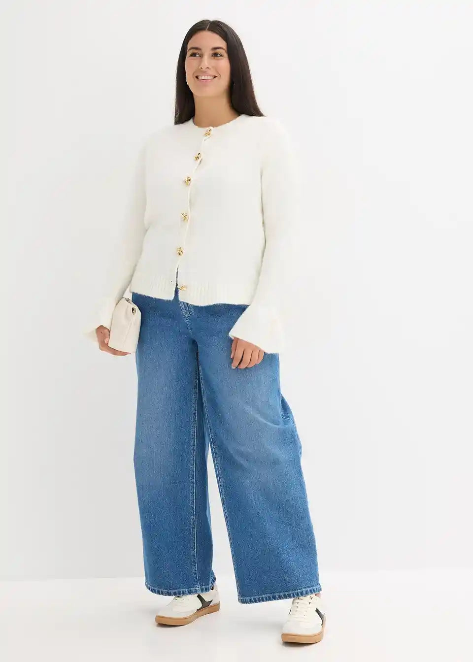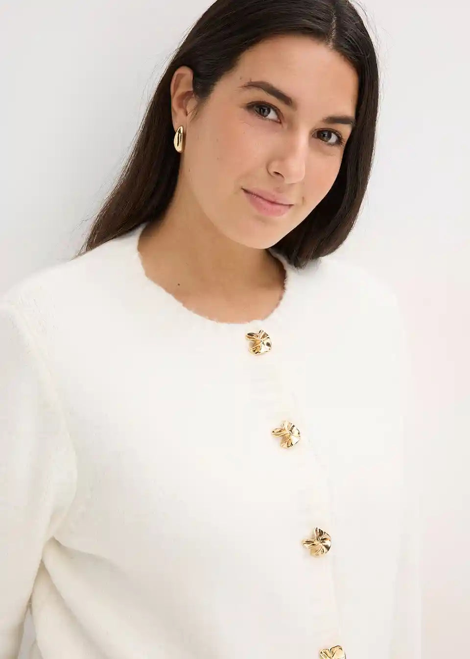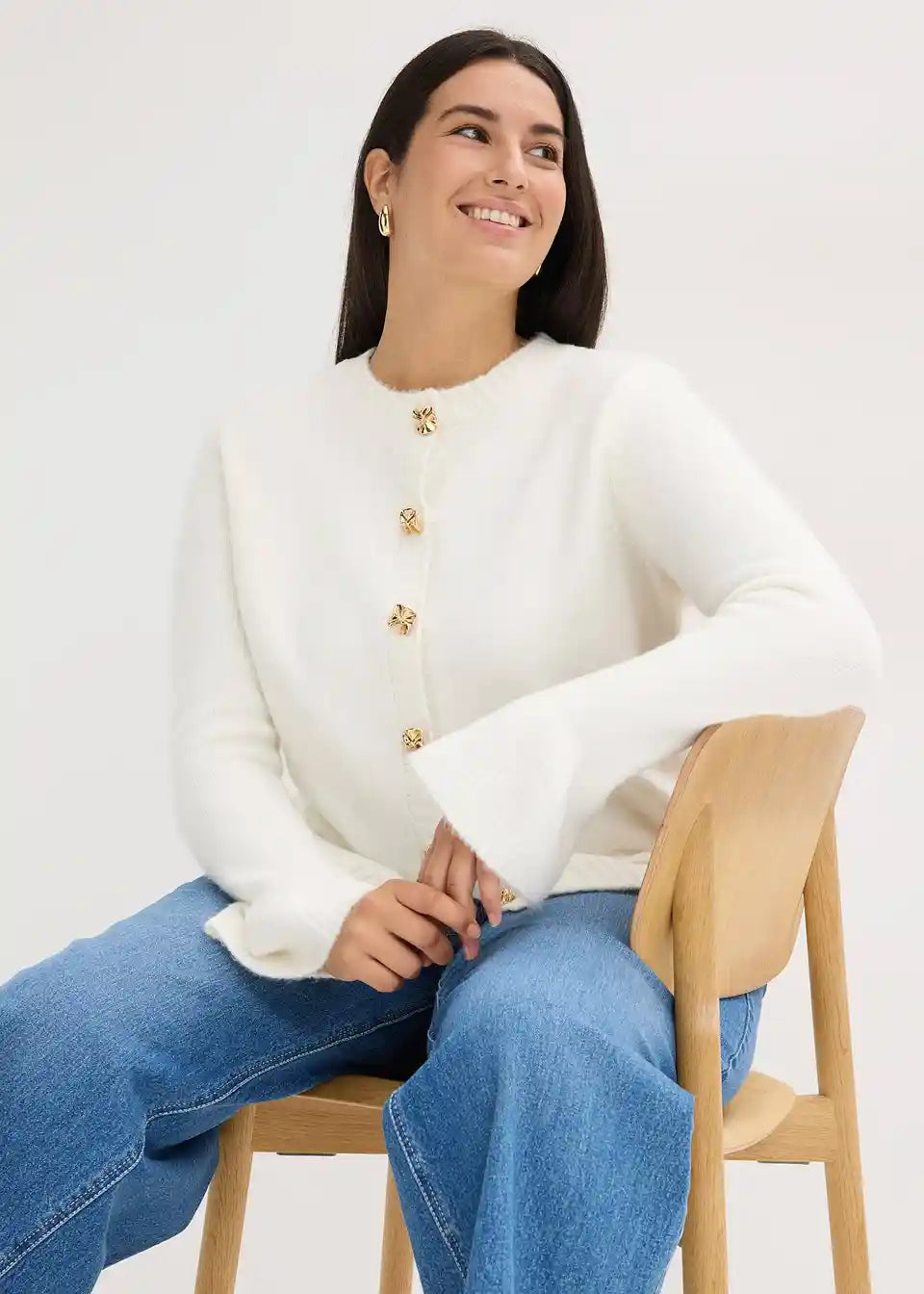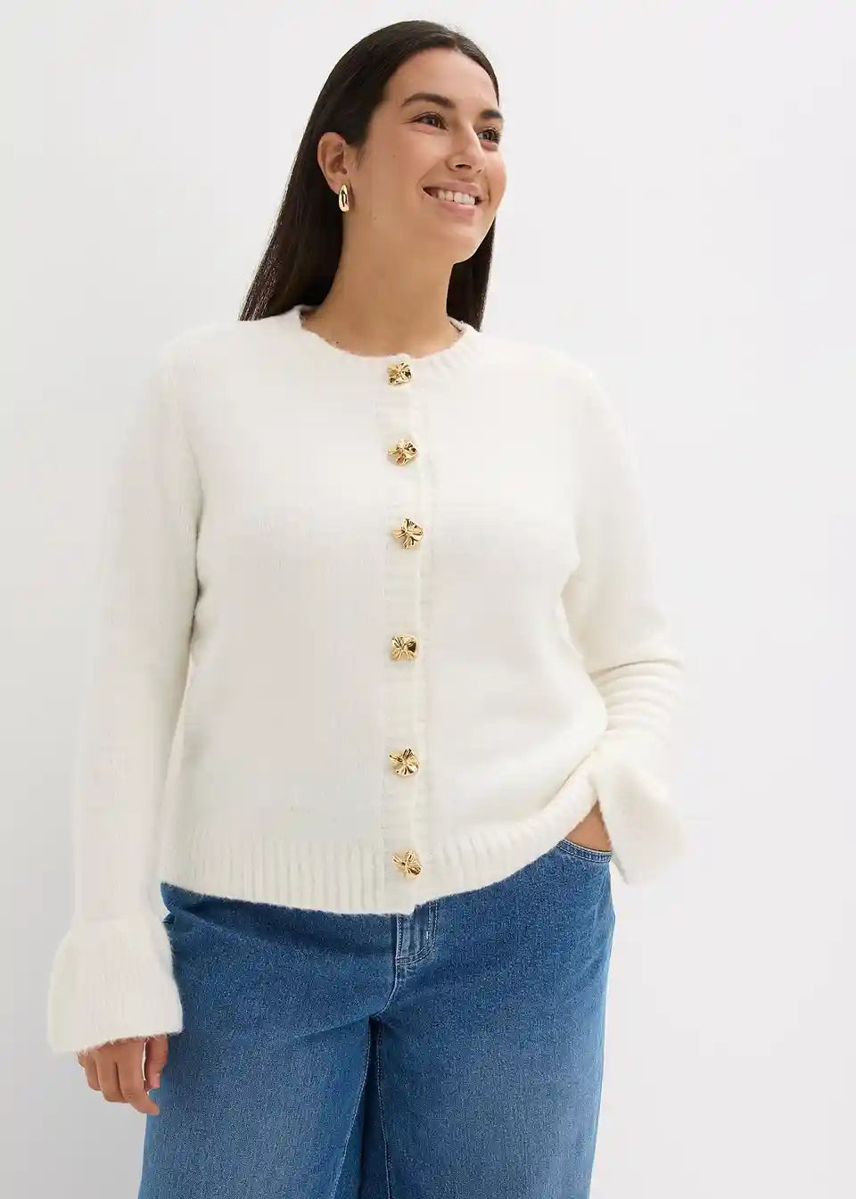 feminine Strickhacke mit dekorativen Knöpfen und Volants am Ärmelsaum