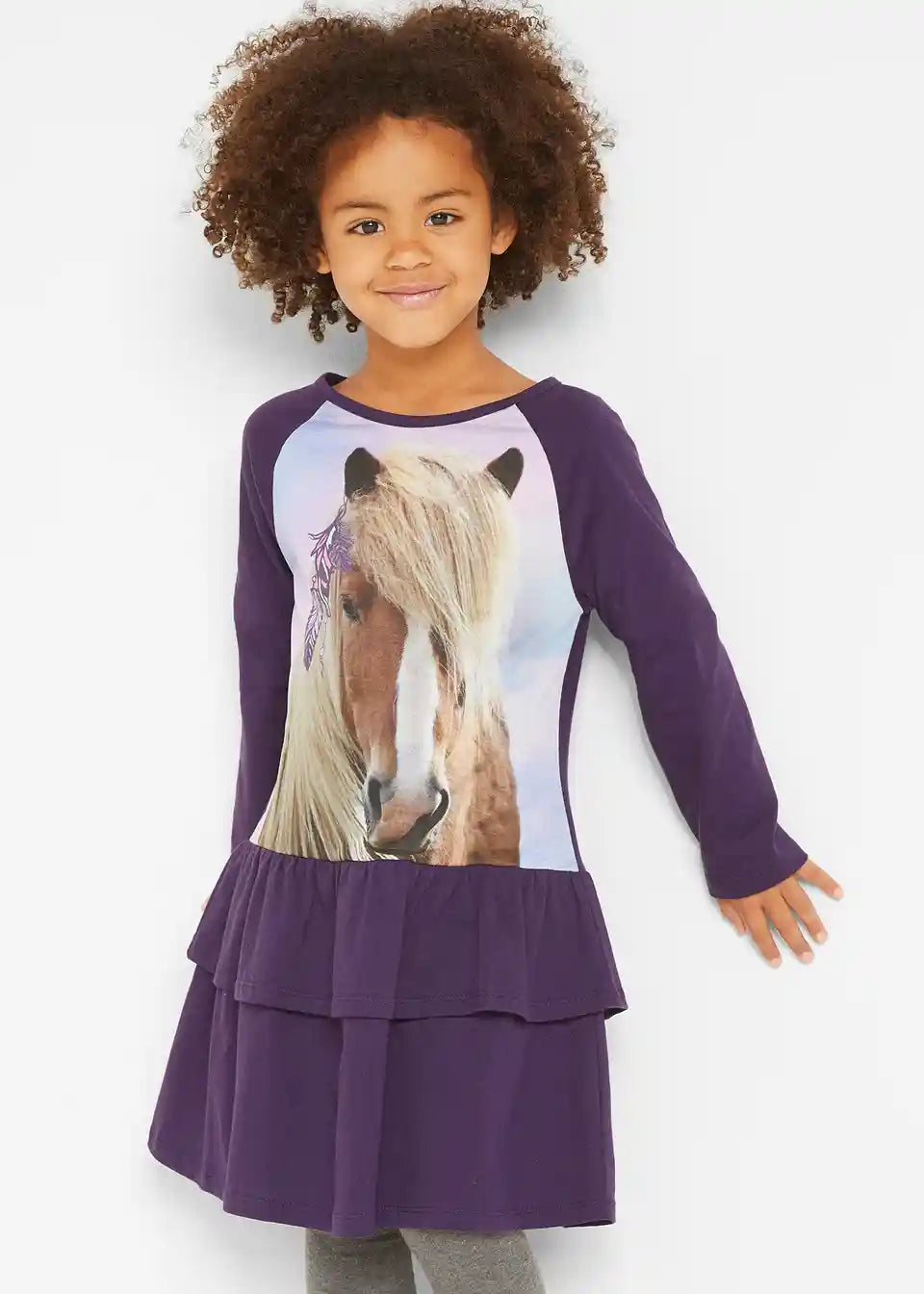 Wunderschönes Jerseykleid für Mädchen mit Volants am Rockteil und einem großen Pferdedruck an der Vorderseite.