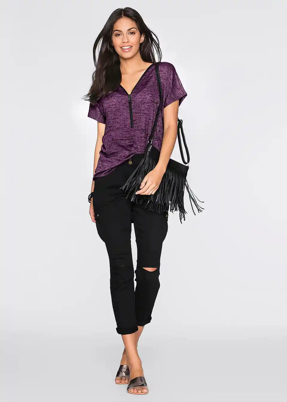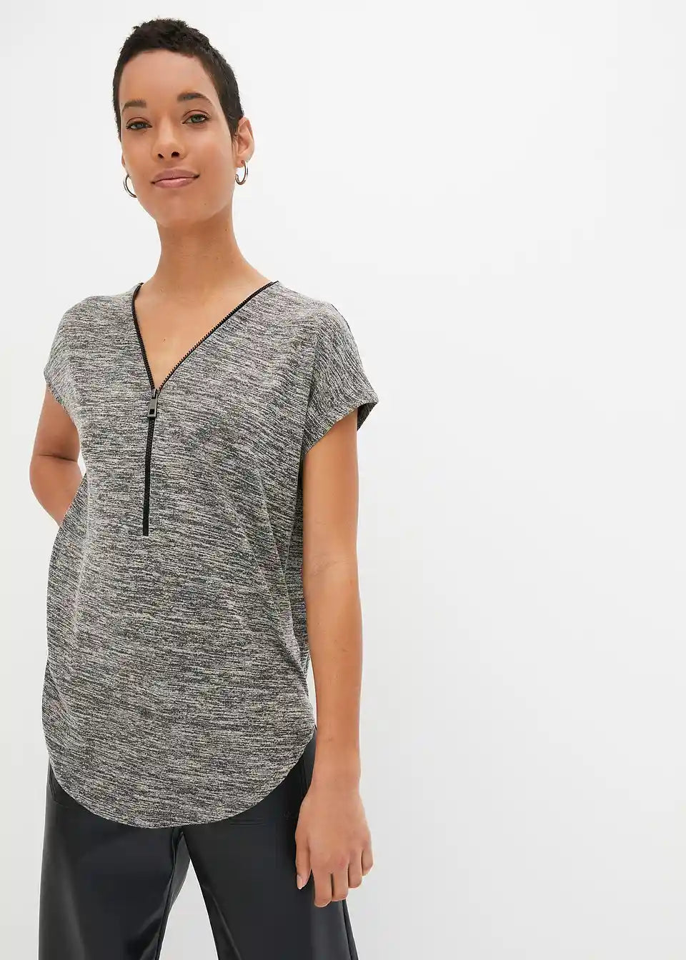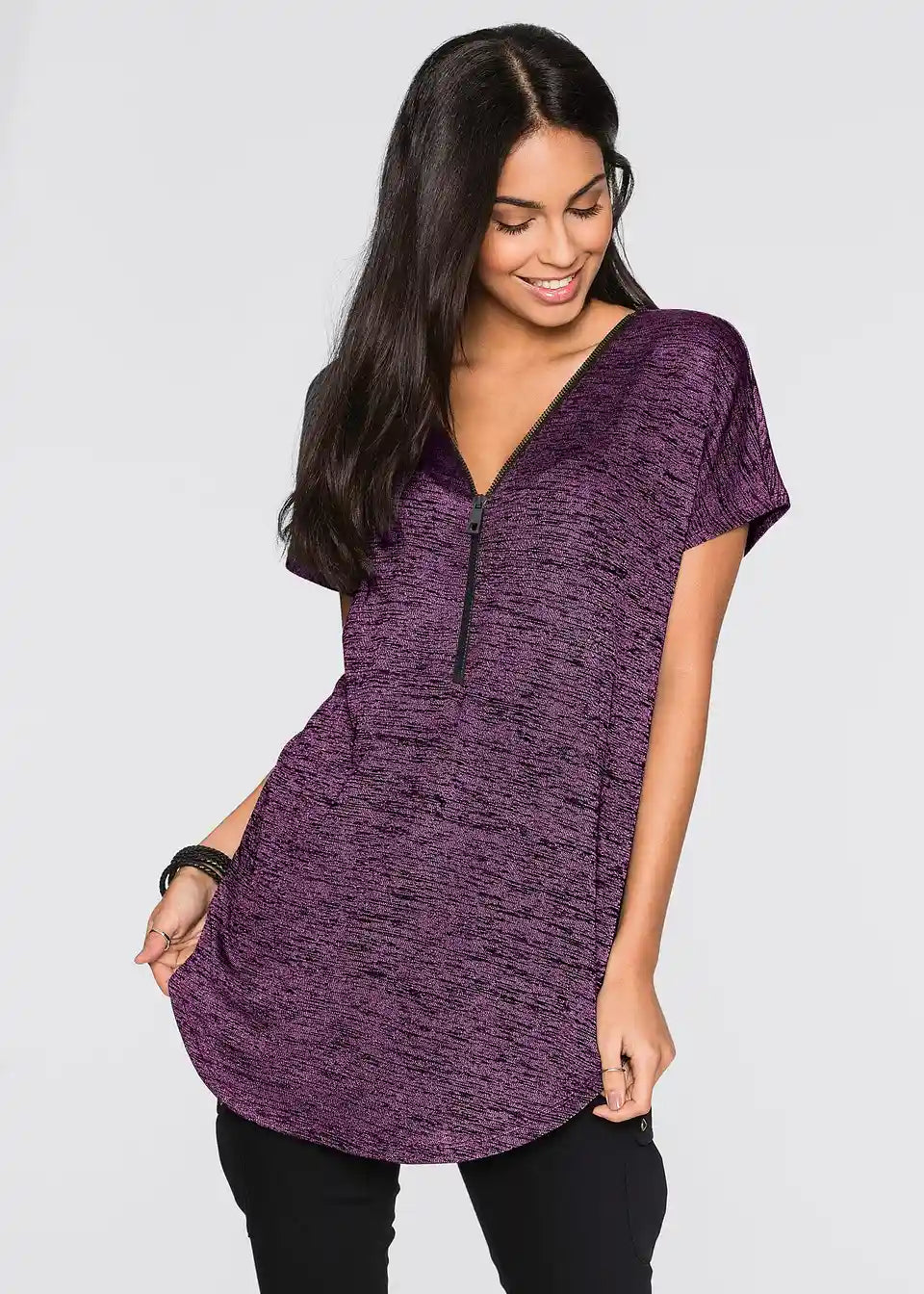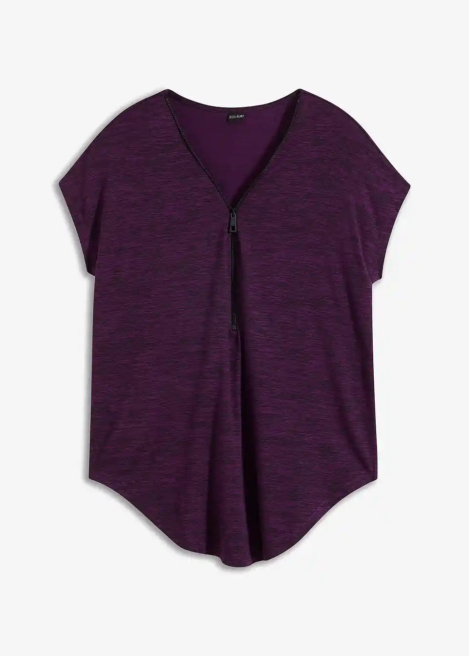 Der locker weite Schnitt macht dieses Oversize-Shirt mit Reißverschluss von BODYFLIRT zu einem entspannten Oberteil, mit dem sich viele ansprechende Outfits zusammenstellen lassen. Das Modell mit kurzen überschnittenen Ärmeln fällt angenehm weit.Der verstellbare Reißverschluss am V-förmigen Ausschnitt ermöglicht die Variation der Ausschnittweite. Das Shirt mit abgerundetem Saum sieht zu engen Hosen, Röcken und Leggings gut aus. Mit einem weiten Unterteil entsteht ein betont femininer Look.