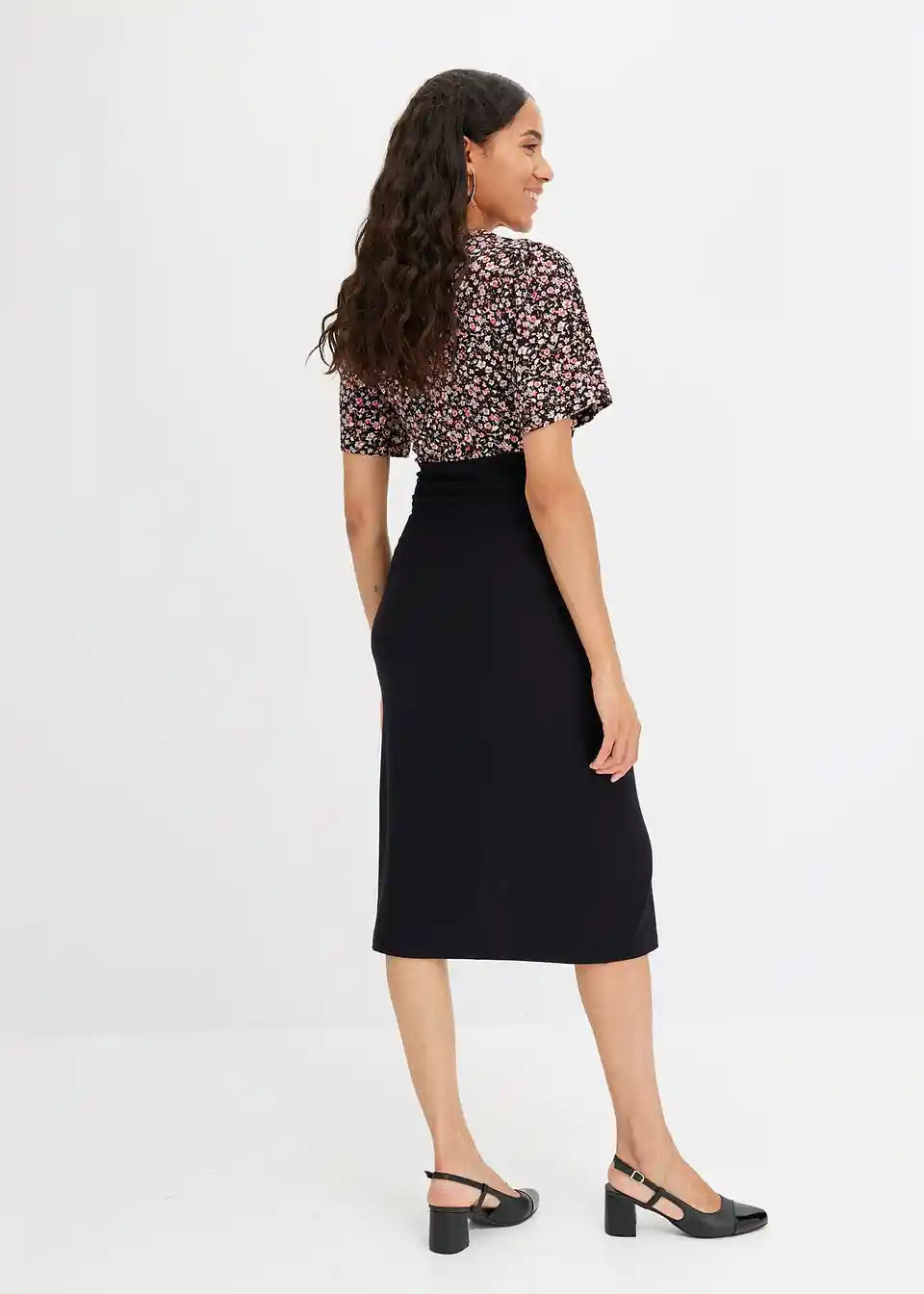 feminines Midikleid mit bedrucktem Oberteil und Schlitz am Rockteil
