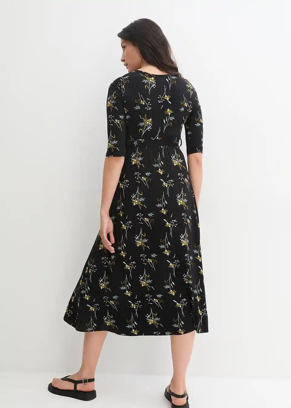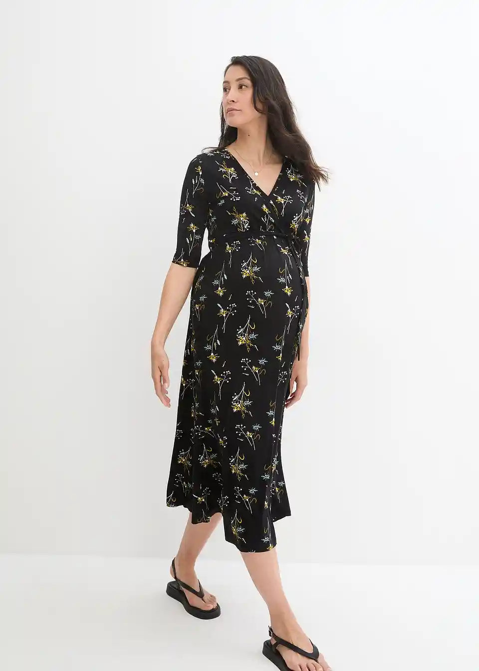 Wadenlanges Kleid aus weichem Viskose-Jersey mit 3/4 Ärmeln und einem abnehmbaren Bindeband unter der Brust. Der Wickelausschnitt ermöglicht ein einfaches Stillen.