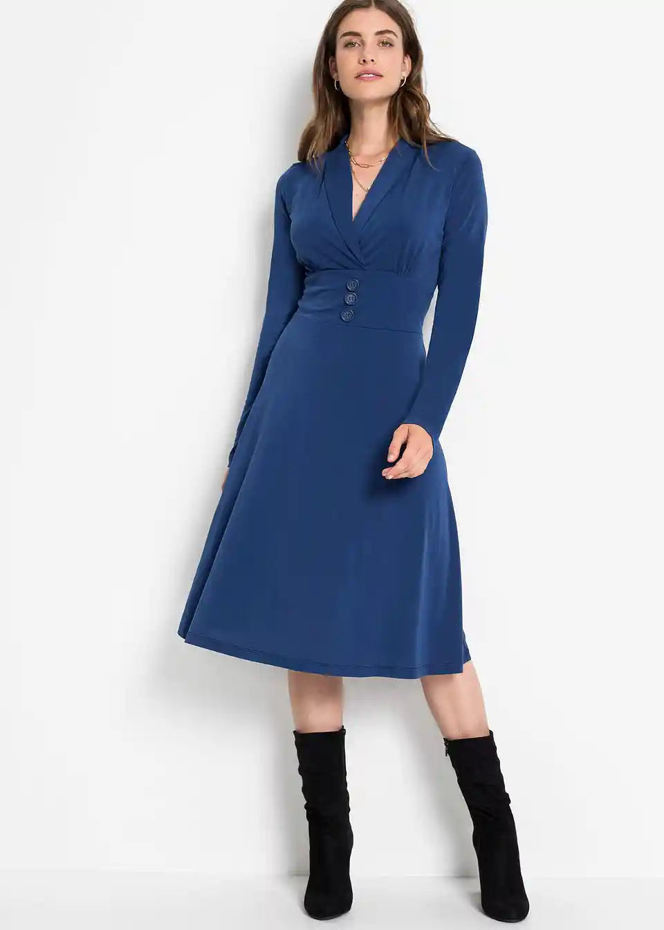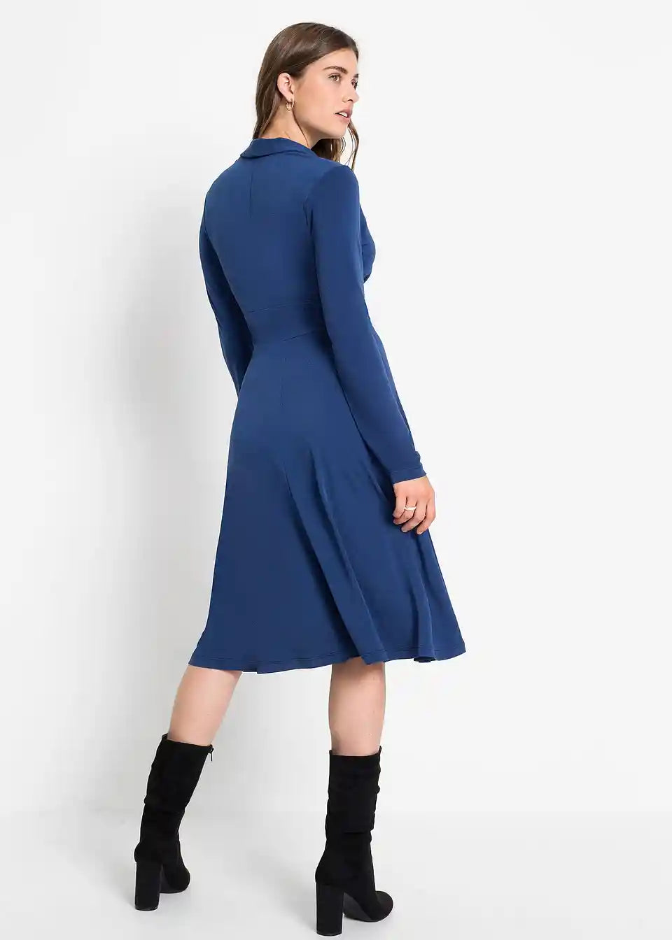 Modisches Jerseykleid mit Knöpfen verziert, das Kleid besitzt einen auffallenden Schal-Kragen.