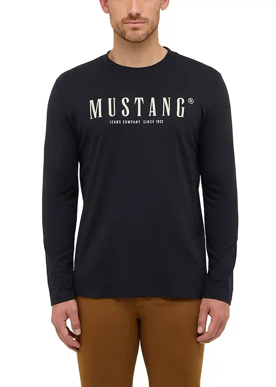 Lässig geschnittenes Langarmshirt von Mustang mit Rundhalsausschnitt und Label-Schriftzug auf der Brust