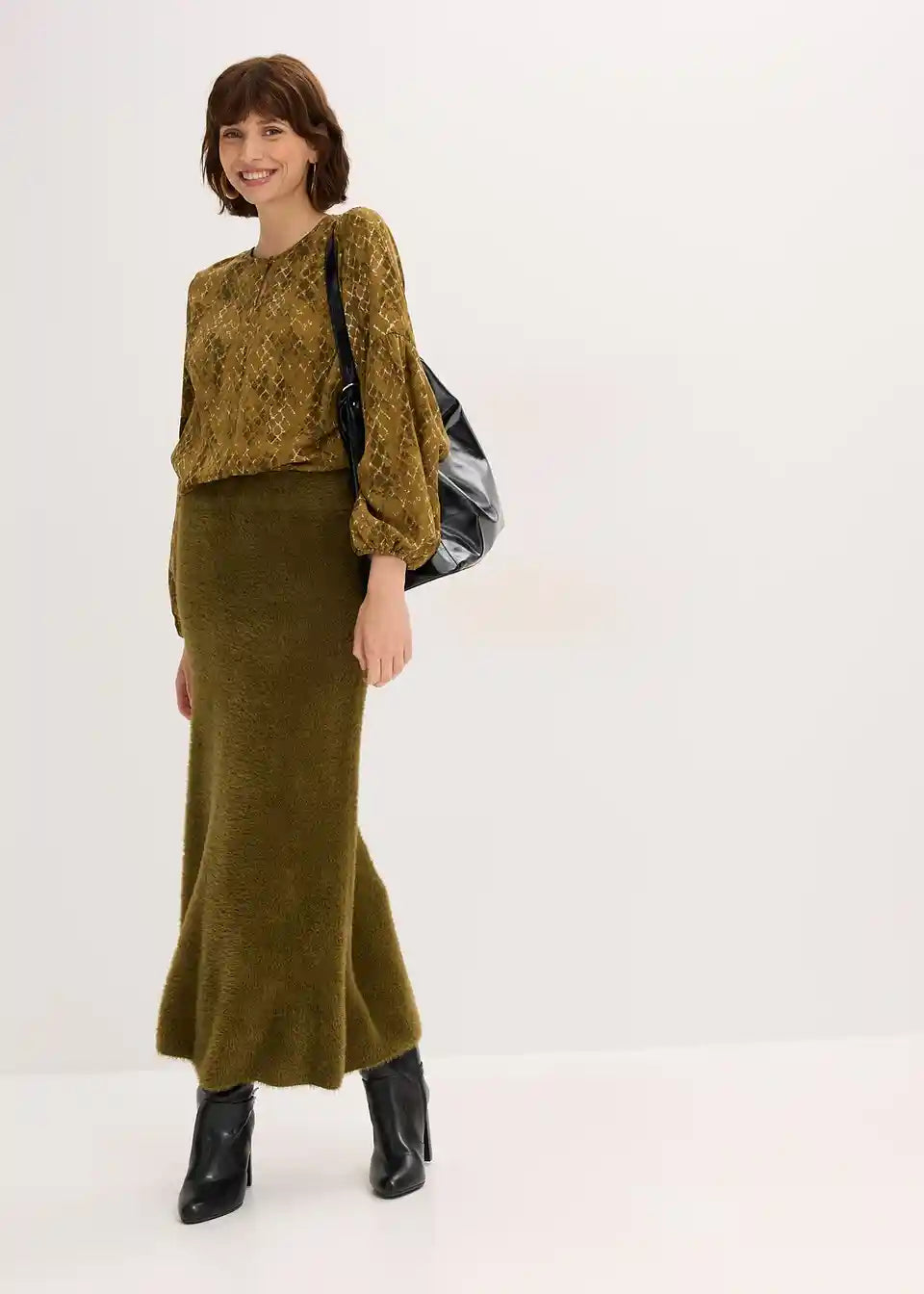 Blusentunika mit schmalem Stehkragen und nach unten weiter werdende Volumenärmel