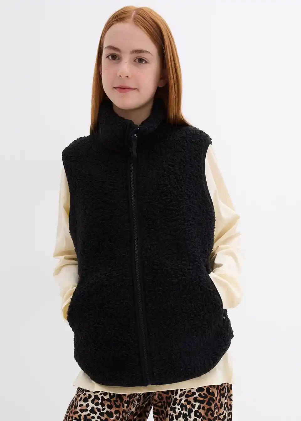 Diese Teddy-Weste ist der perfekte Begleiter für kühle Tage! Sie verfügt über einen praktischen Stehkragen und ist ärmellos. Mit einer lockeren Passform, die die Hüfte bedeckt, bietet sie Komfort und Bewegungsfreiheit. Die runden Säume vorne und hinten sind mit passendem Piping verziert, ebenso wie der Saum und der Reißverschluss. Die Weste hat einen praktischen Reißverschluss mit einem dazu passenden Zugband und bietet zudem zwei Reißverschlusstaschen mit Piping. Ein Must-have für jede junge Garderobe – einfach anziehen und wohlfühlen!
