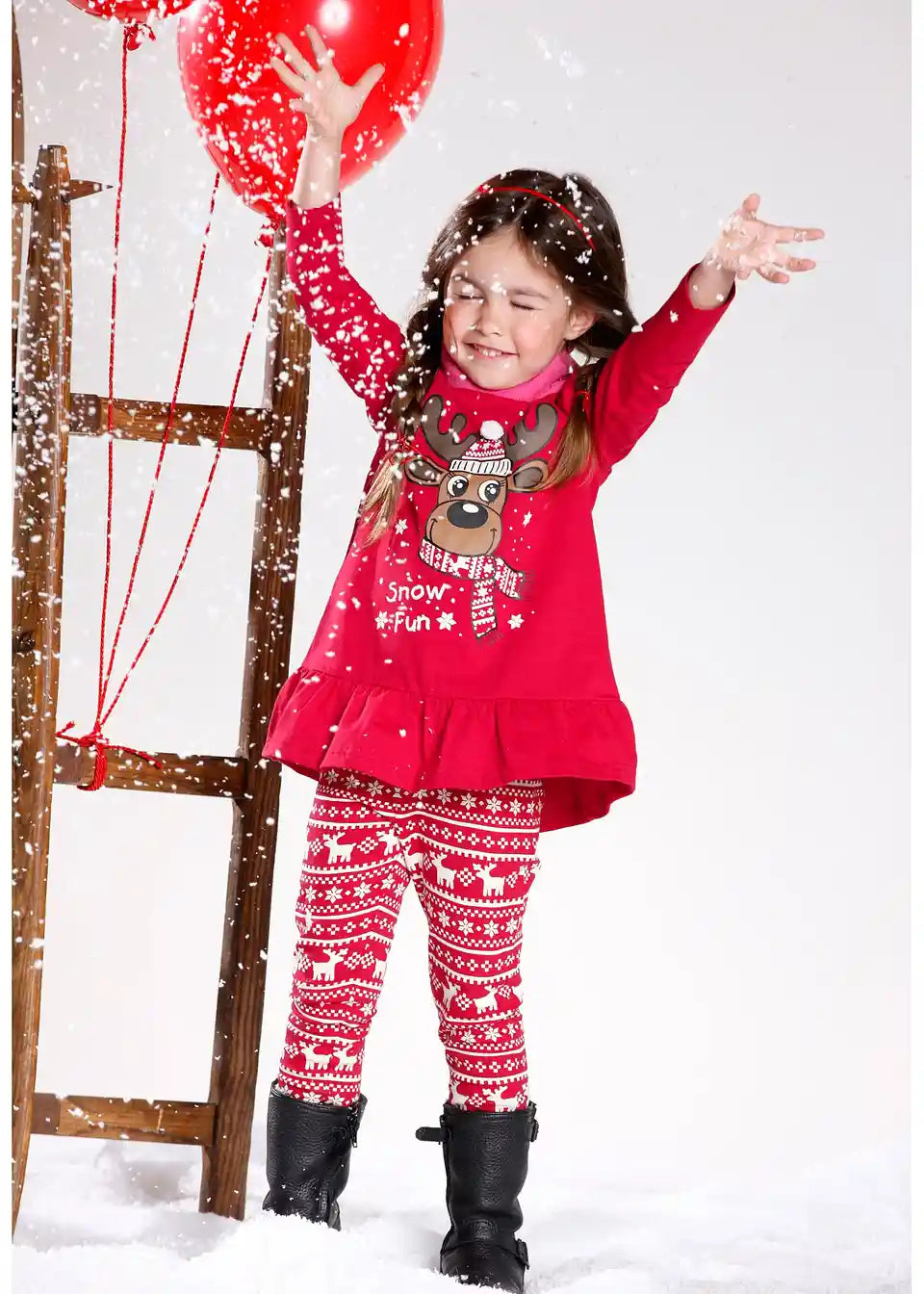 Weihnachtliches Shirt mit Elch-Motiv und Leggings für Mädchen. Langarmshirt mit Volant und Leggings mit tollem Allover-Print.