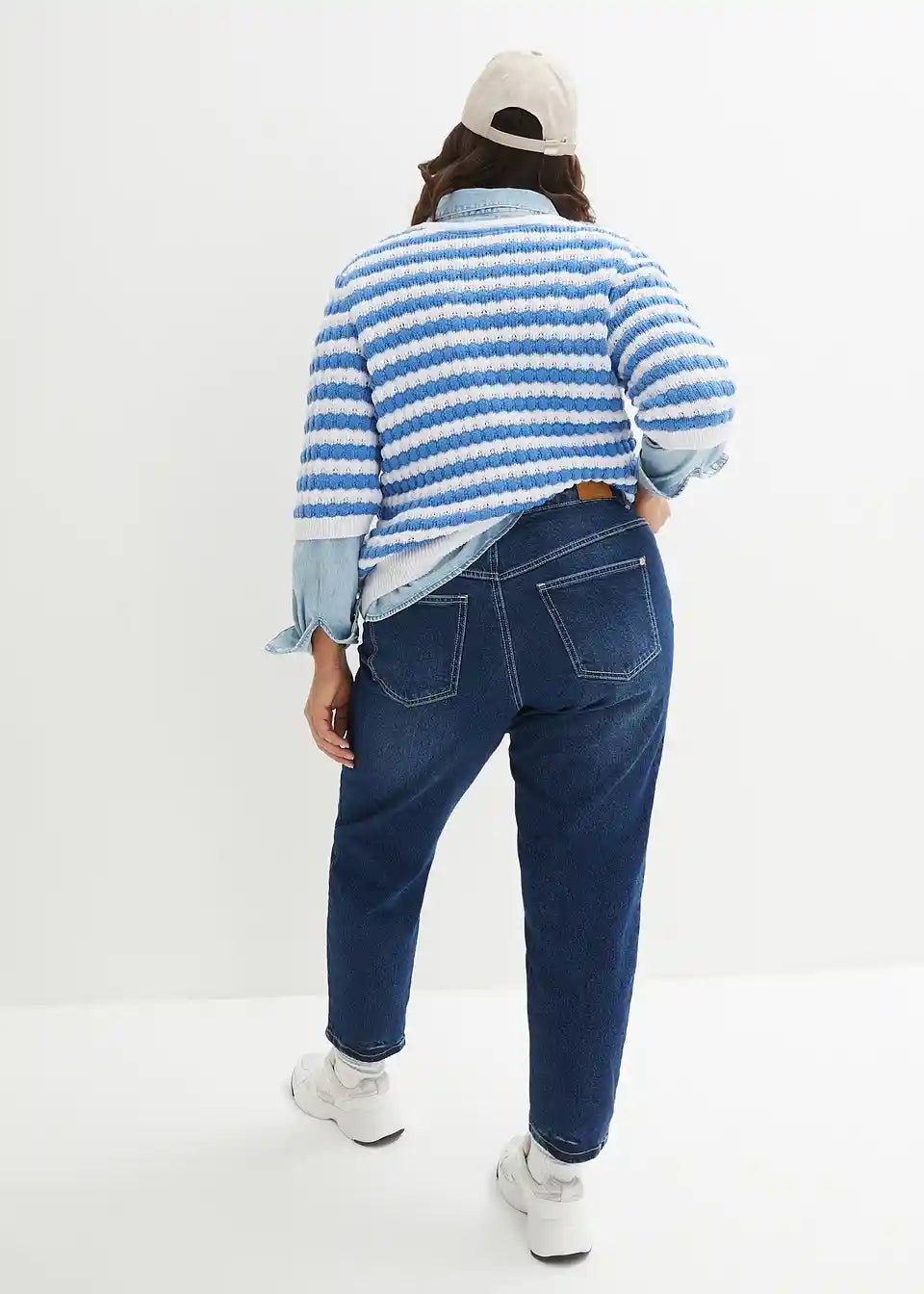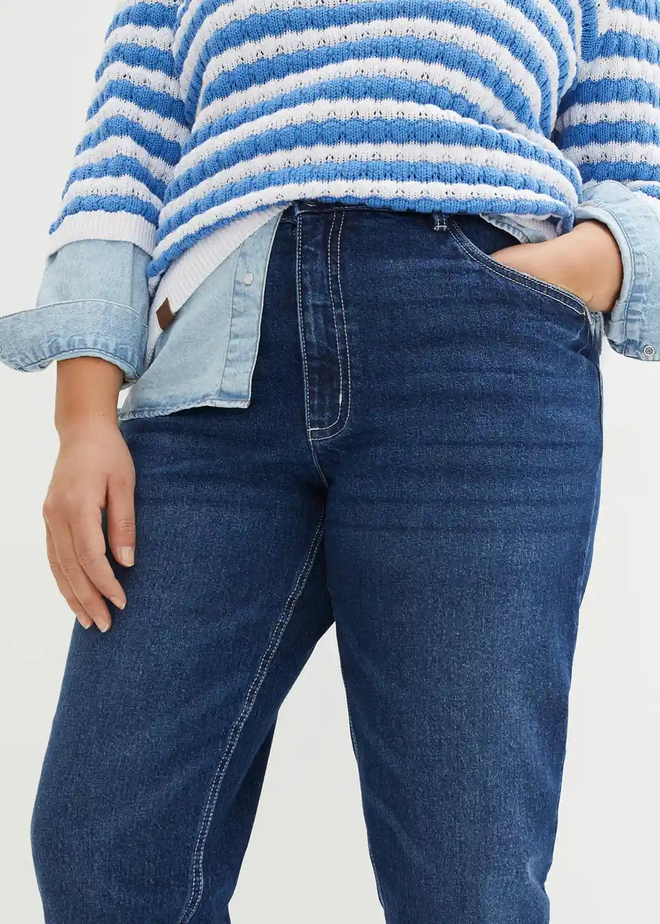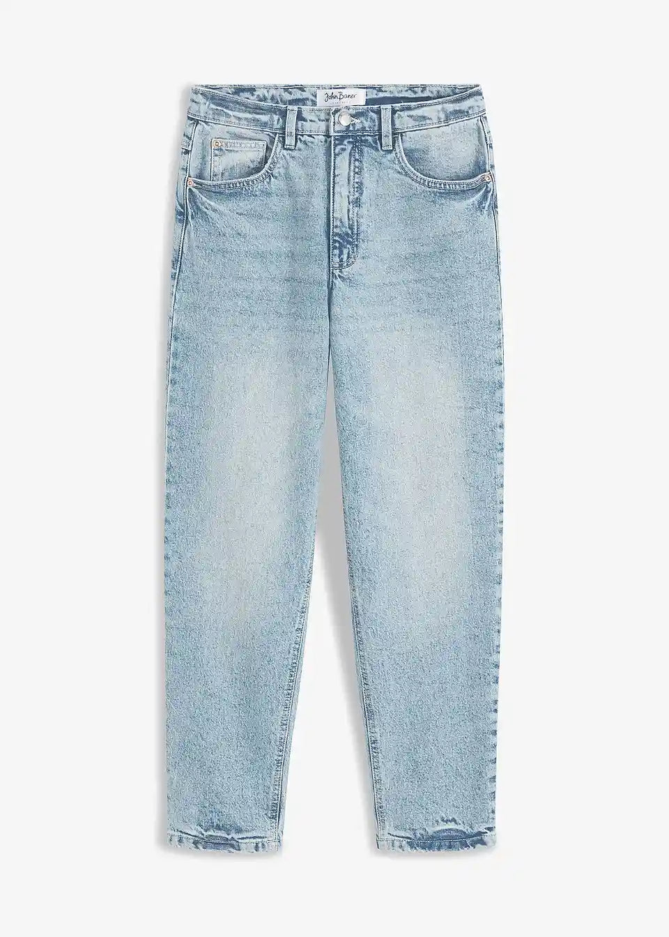 Mom Jeans mit hohem Bund aus einem festen Baumwolldenim, der sich zunächst etwas steif anfühlt und durch häufiges Tragen weicher und lockerer wird.