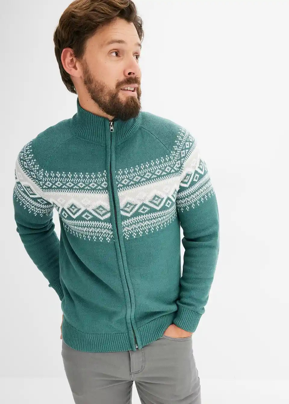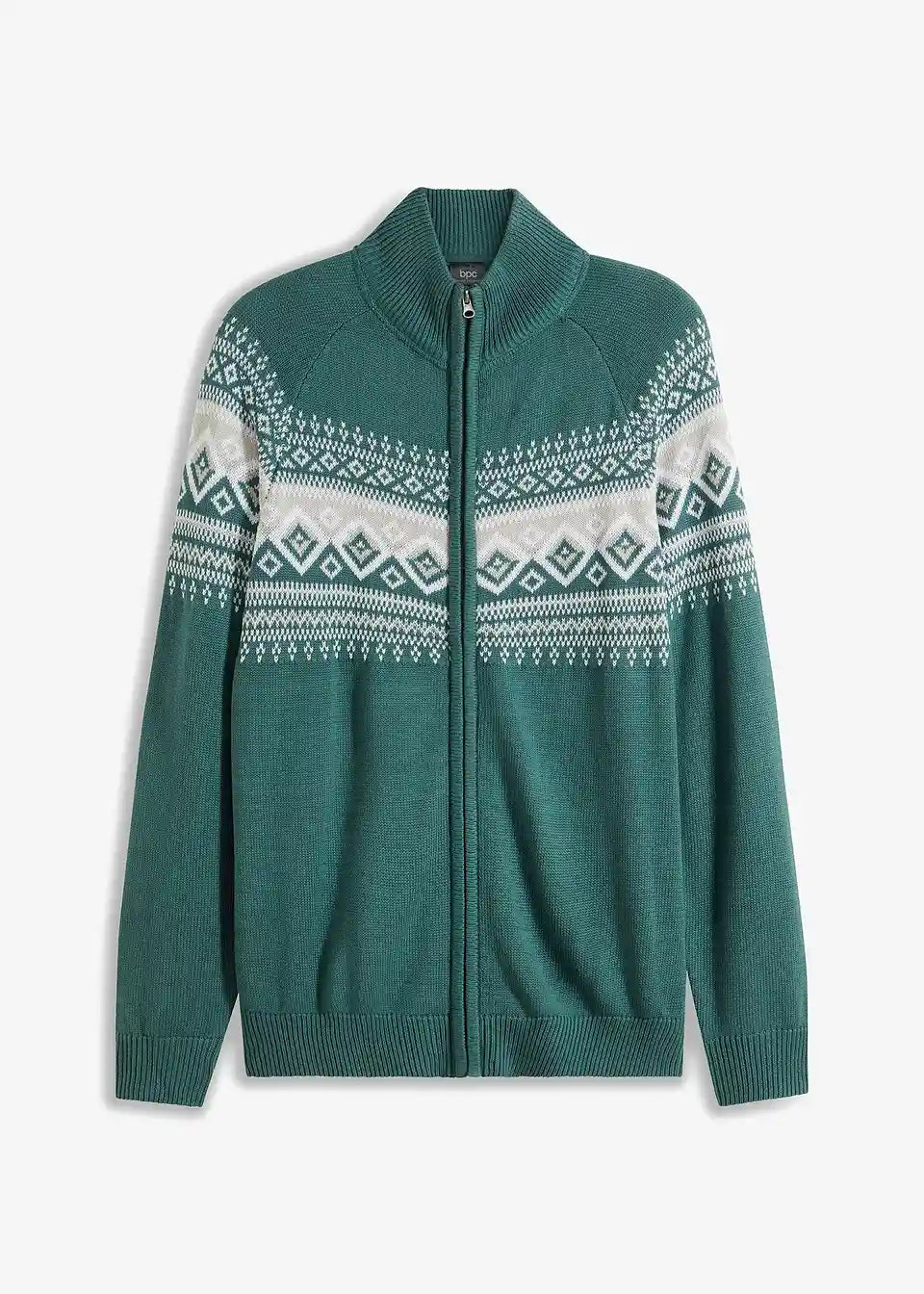 Diese bequeme Herren Strickjacke im Regular Fit der Marke bpc wärmt an kühlen Tagen und sorgt für einen tollen Look. Das klassische Muster im Norweger-Design, der Stehkragen und die Rippstrickbündchen am Saum sowie an den Ärmeln geben dem Modell eine ansprechende Note. Auf der Vorderseite schließt die Jacke mit einem Reißverschluss.