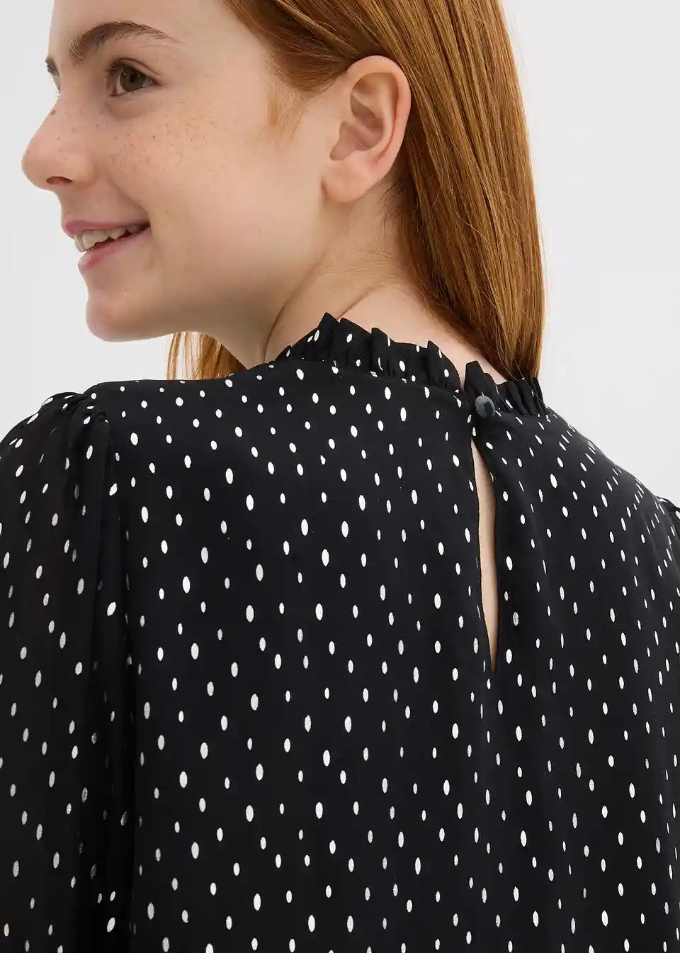 Diese bezaubernde Chiffonbluse kombiniert Stil und Komfort! Mit einem runden Halsausschnitt und einem charmanten Rüschenkragen verleiht sie jedem Outfit eine süße Note. Die Bluse hat lange Puffärmel mit einem geschmückten Bündchen, das für einen modischen Akzent sorgt. Die reguläre Passform und die hüftlange Tunikaform bieten eine bequeme Silhouette, während der elegante Rückenausschnitt mit einem Knopfverschluss für eine besondere Detailverliebtheit sorgt. Ideal für festliche Anlässe oder schicke Alltagslooks.