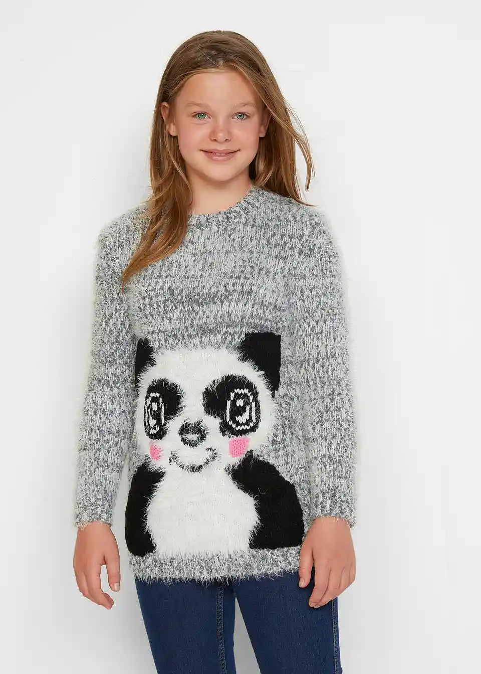 Kuschelig und lässig zeigt sich dieser weiche Pullover für Mädchen. Der auffallende Pullover der Marke bpc ist aus raffiniertem Federgarn gearbeitet und reicht bis über die Hüfte. Ein toller Hingucker ist das Modell dank seines großen eingestrickten Motivs auf der Vorderseite. Der flauschige Strickpullover eignet sich ideal als ein modischer Begleiter an kühlen Tagen.