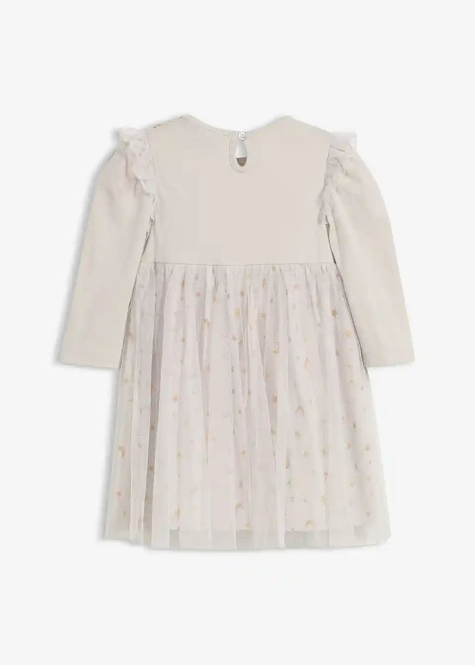 Praktisches Bodykleid mit Tüllrock und glitzernden Sternen. Der integrierte Body ist mit Druckknöpfen im Schritt ausgestattet und erleichtert so das An- und Ausziehen sowie das Wickeln. Der leichte Tüllrock mit Rüschen verleiht dem Kleid einen festlichen Charakter – ideal für besondere Anlässe.
