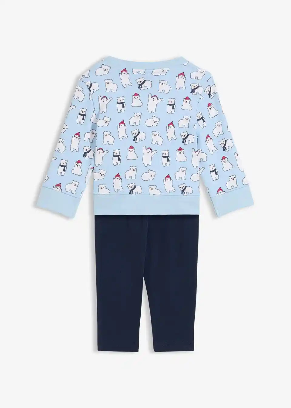 Niedliches 2-teiliges Set bestehend aus Sweatshirt und Krabbelleggings aus 100 % Bio-Baumwolle – super weich und angenehm auf der Haut. Das Sweatshirt ist mit praktischen Druckknöpfen auf der Schulter ausgestattet und lässt sich so leicht an- und ausziehen.Die Leggings mit elastischem Bund bieten viel Bewegungsfreiheit, während die verstärkten Patches auf den Knien ideal zum Krabbeln sind. Süße Eisbären-Motive runden das Design ab und machen das Set zu einem perfekten Begleiter für Alltag und Spiel.
