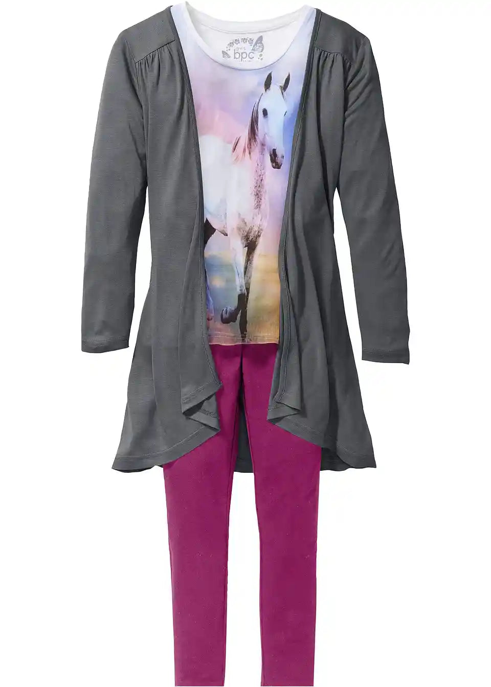 Dieses dreiteilige Set von bpc lässt Mädchenherzen höher schlagen. Ein toller Fotoprint mit Pferdemotiv schmückt die Vorderseite des kurzärmligen Shirts, das aus einem angenehm leichten Material besteht. Der langärmlige Cardigan ist an der Schulter mit leichten Raffungen versehen, die ihm eine verspielte Note geben.Die Leggings des Sets ist in Kontrastfarbe gehalten und bietet dank Gummizugbund hohen Tragekomfort.