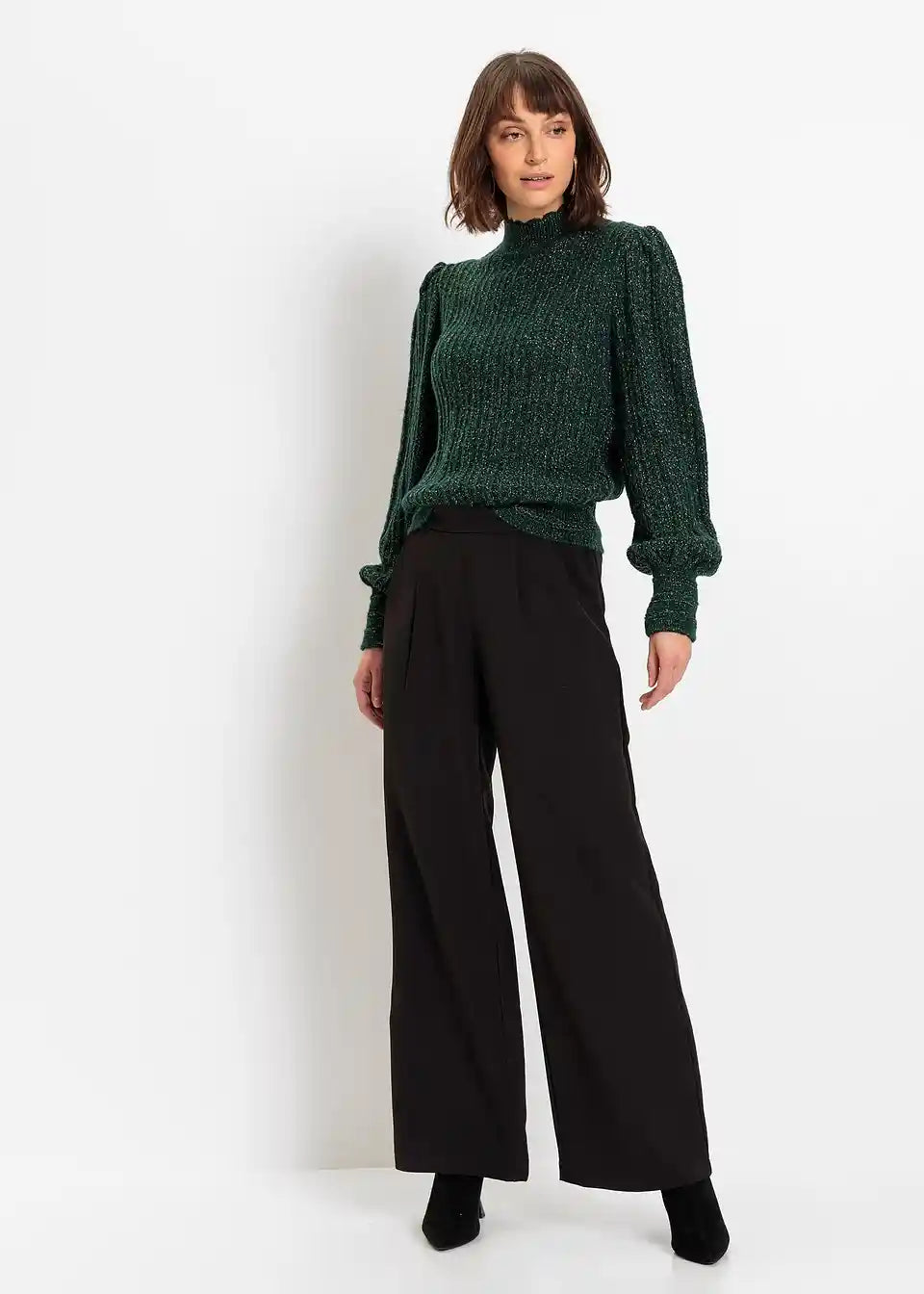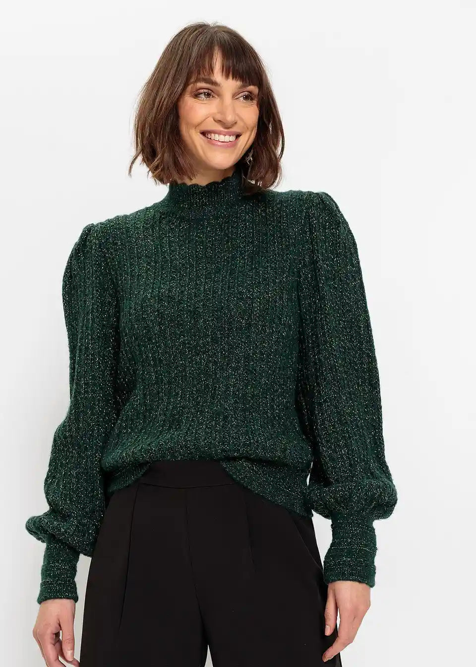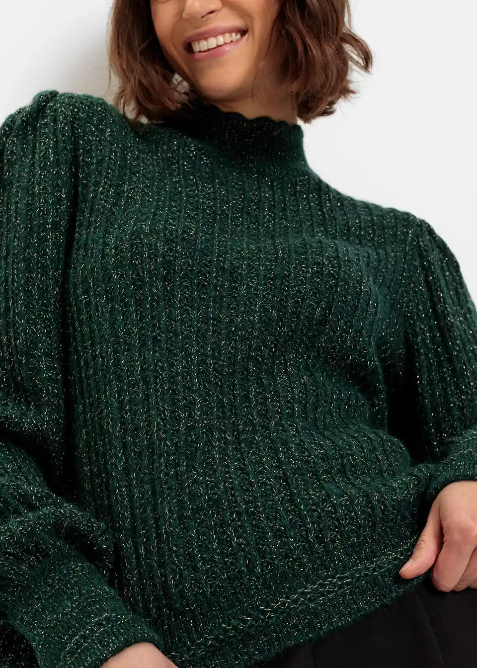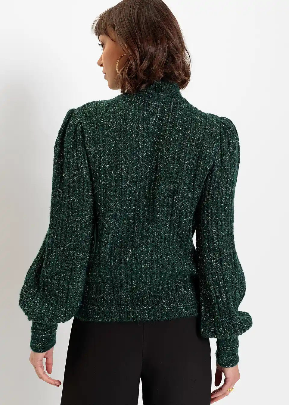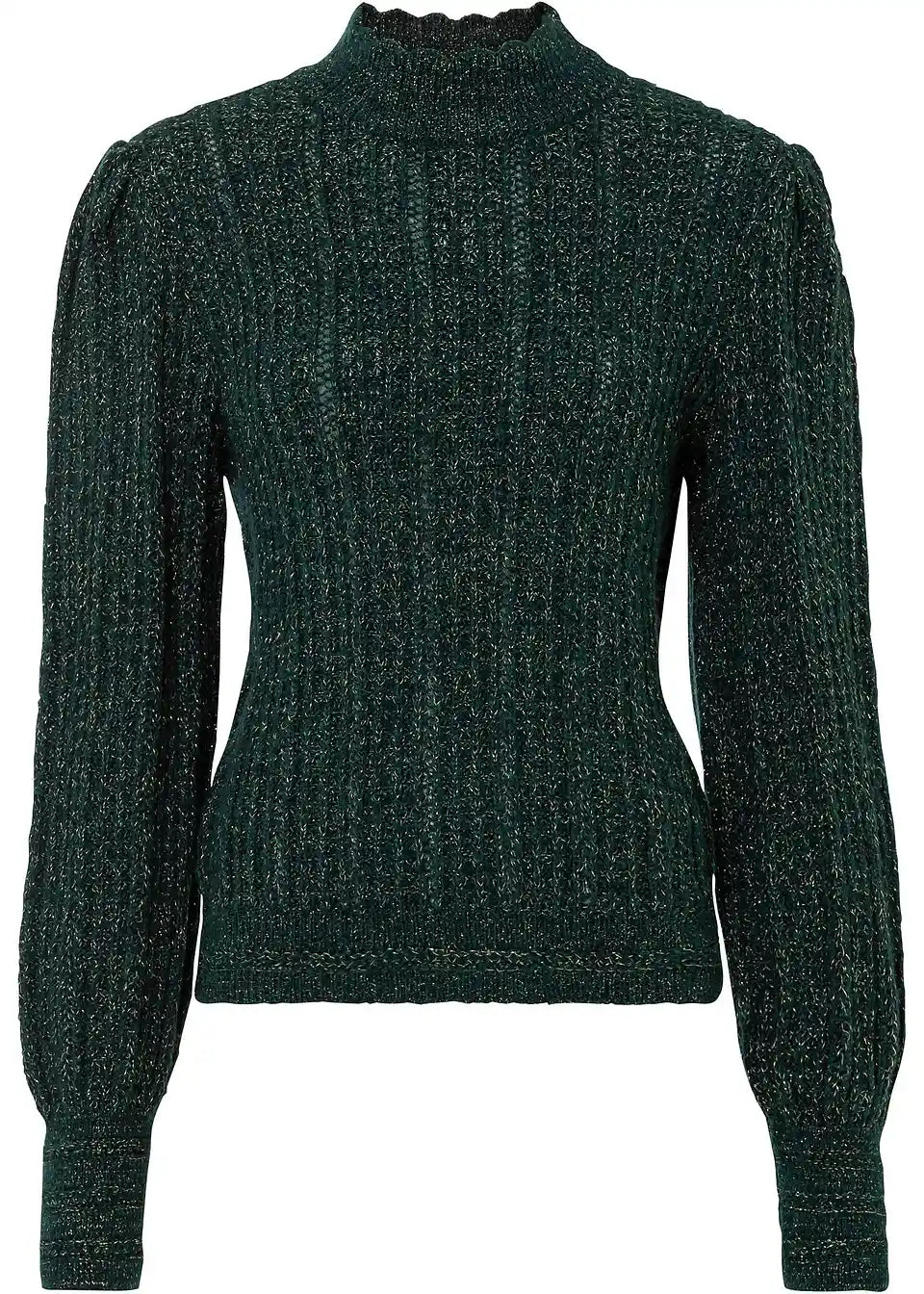 Glanzvoller Strickpullover mit schimmerndem Faden und besonderem Kragenabschluss
