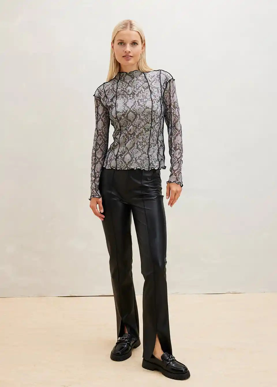 Figurbetonte Hose in Lederimitat-Optic mit tollen Nähten und Reißverschluss hinten.