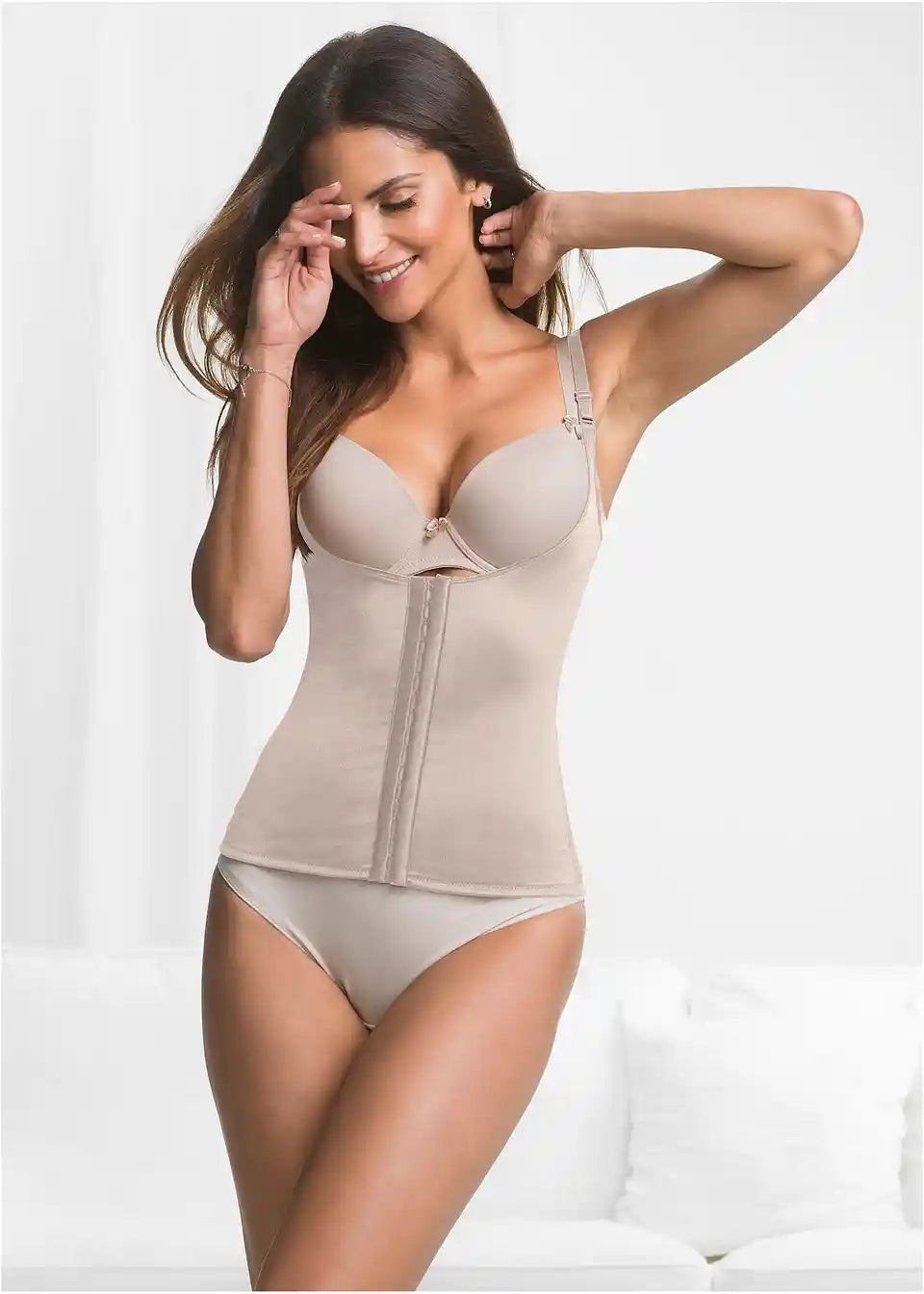 Optimal in Form: Diese Corsage von Nice Size überzeugt mit ihrem sensationellen Form-Effekt. Für perfekten Halt sorgen die verstellbaren Träger und das Silikonband. Die Stützfunktion im mittleren Körperbereich und der Shape-Effekt betonen die weibliche Silhouette.Verschlossen wird die Corsage an der Vorderseite mithilfe von Haken und Ösen. Diese Shape-Wear ist perfekt mit einem Polster-BH kombinierbar.