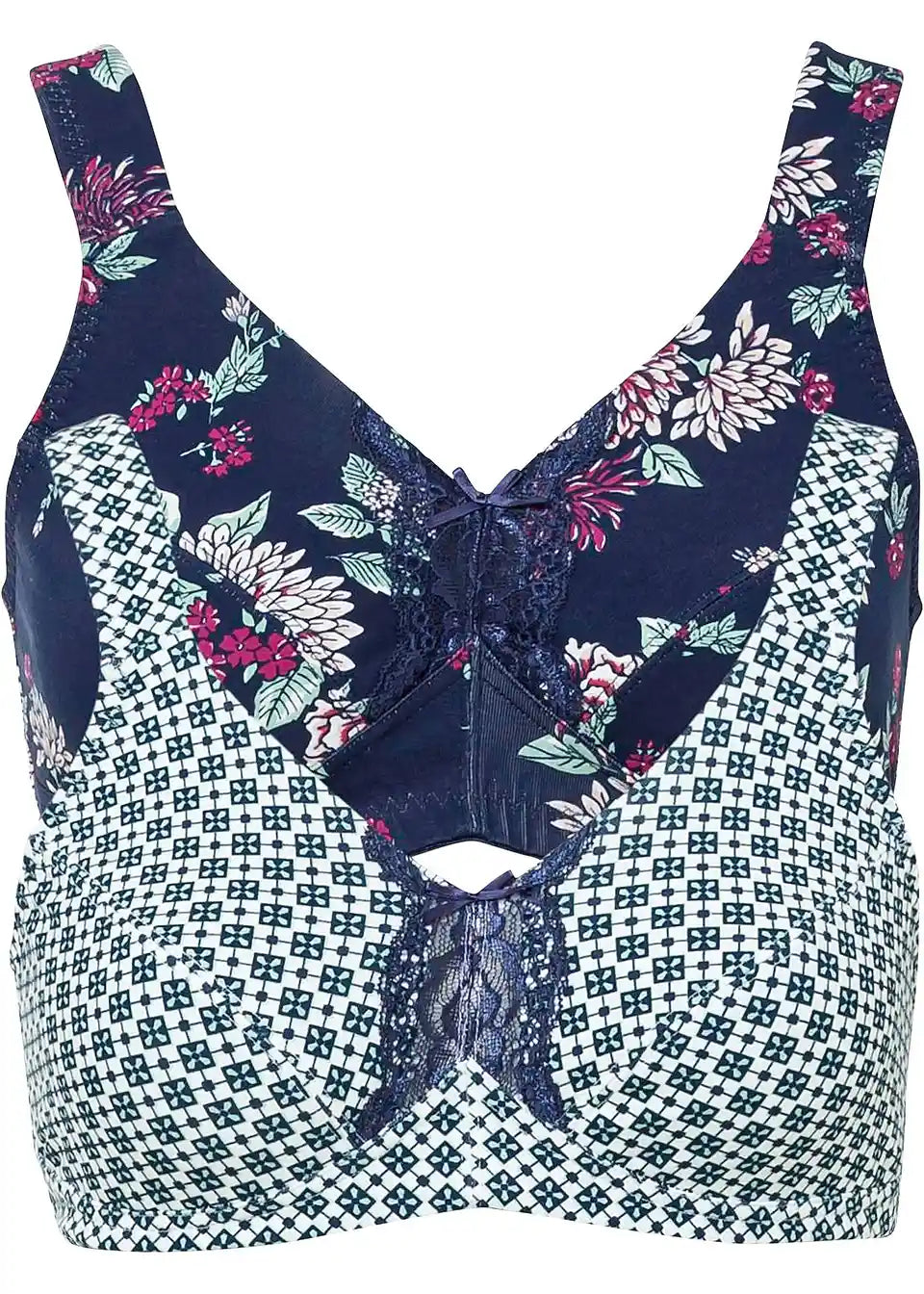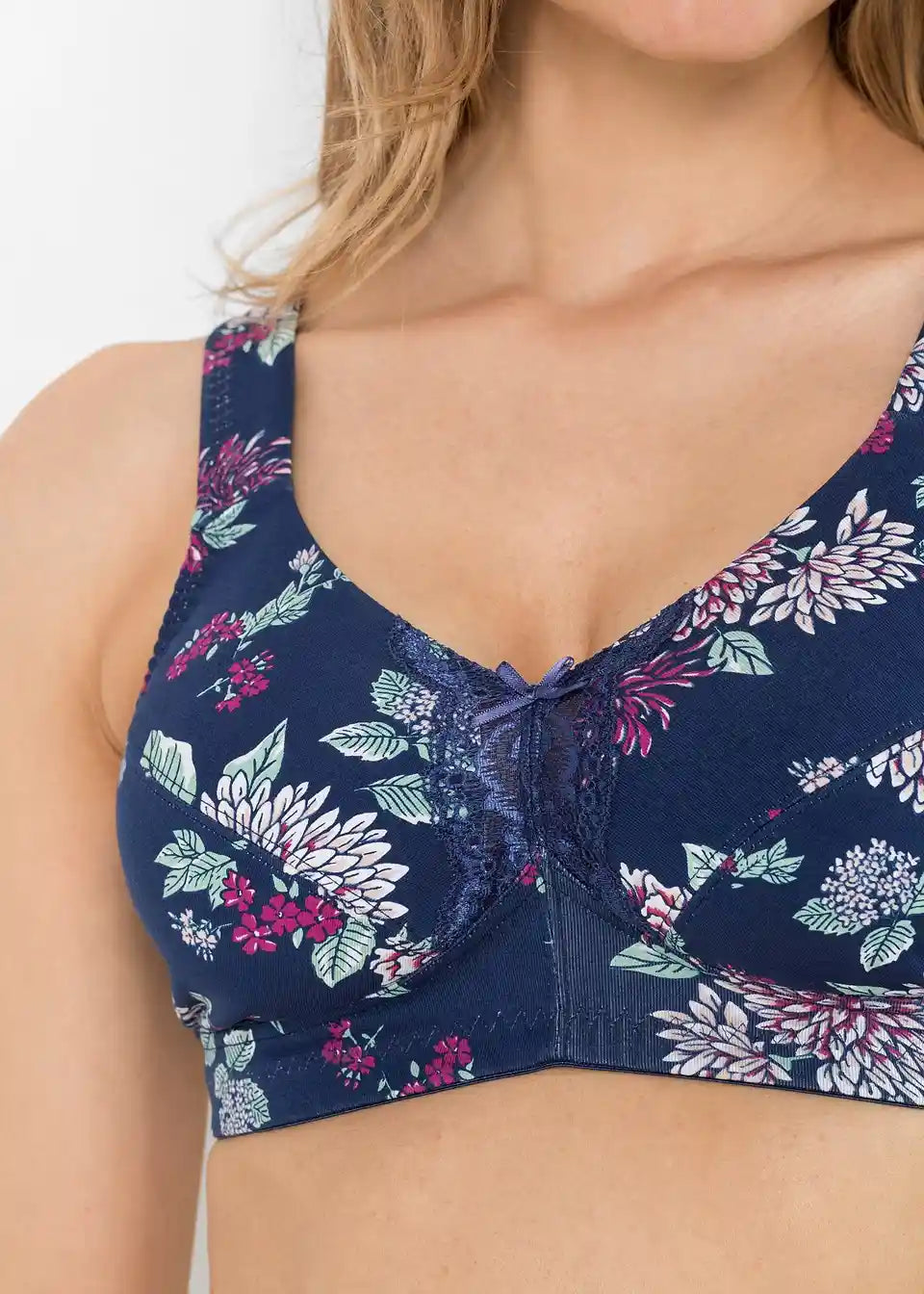 Der BH hat dank der breiten, gepolsterten Träger und der bügellosen Verarbeitung eine angenehme Passform. Die Bio-Baumwolle verleiht zudem ein weiches Tragegefühl. Dieser BH ohne Bügel wird von einem Blumendruck und einer Spitze geziert.