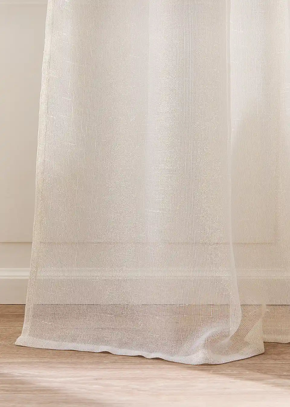 Sehr schöner Stoff: gewebt und mit goldnem Schimmer. Bügeln, raffen, Häkchen dran und aufhängen.