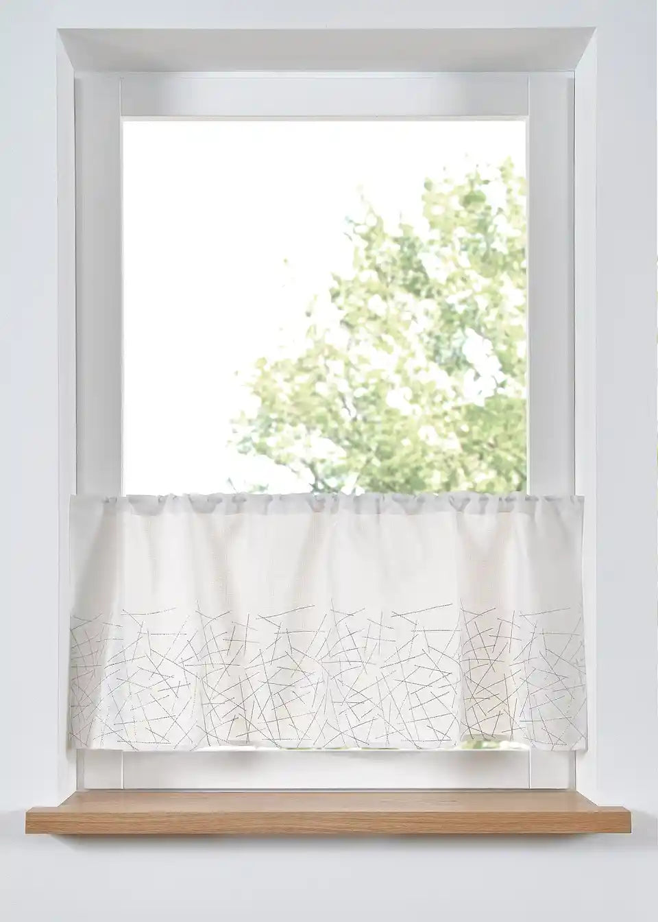 Die Küchengardine hat einen edlen Touch, denn sie hat eine silberfarbene Stickerei mit zartem Glanz. Sie schmückt Dein Küchenfenster auf moderne Art.