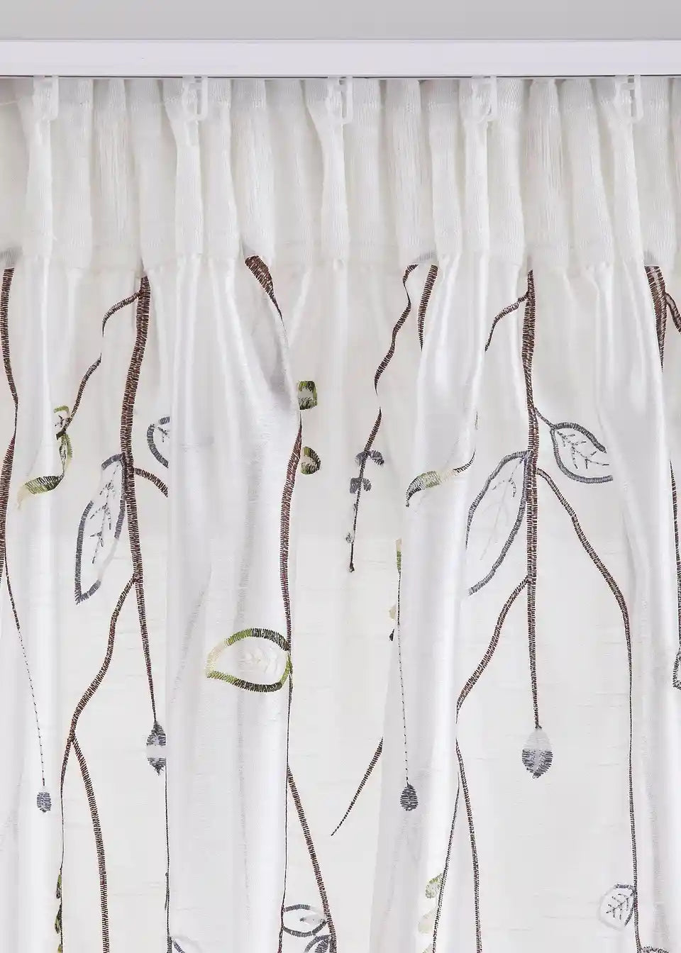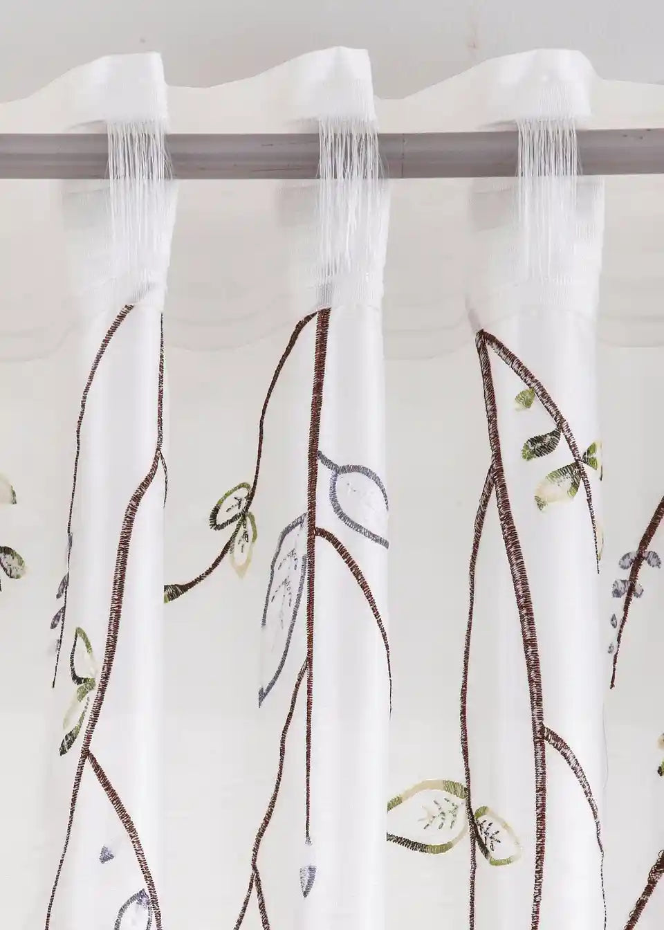 Dieser Vorhang ist etwas ganz Besonderes. Er ist aus fein glänzendem Gewebe gefertigt in Seiden-Optik und hat eine verspielte zarte Stickerei, die von unten als auch von oben aufgebracht ist. Die Farben harmonisieren hervorragend miteinander, so dass das Gesamtbild einfach bezaubernd ist.